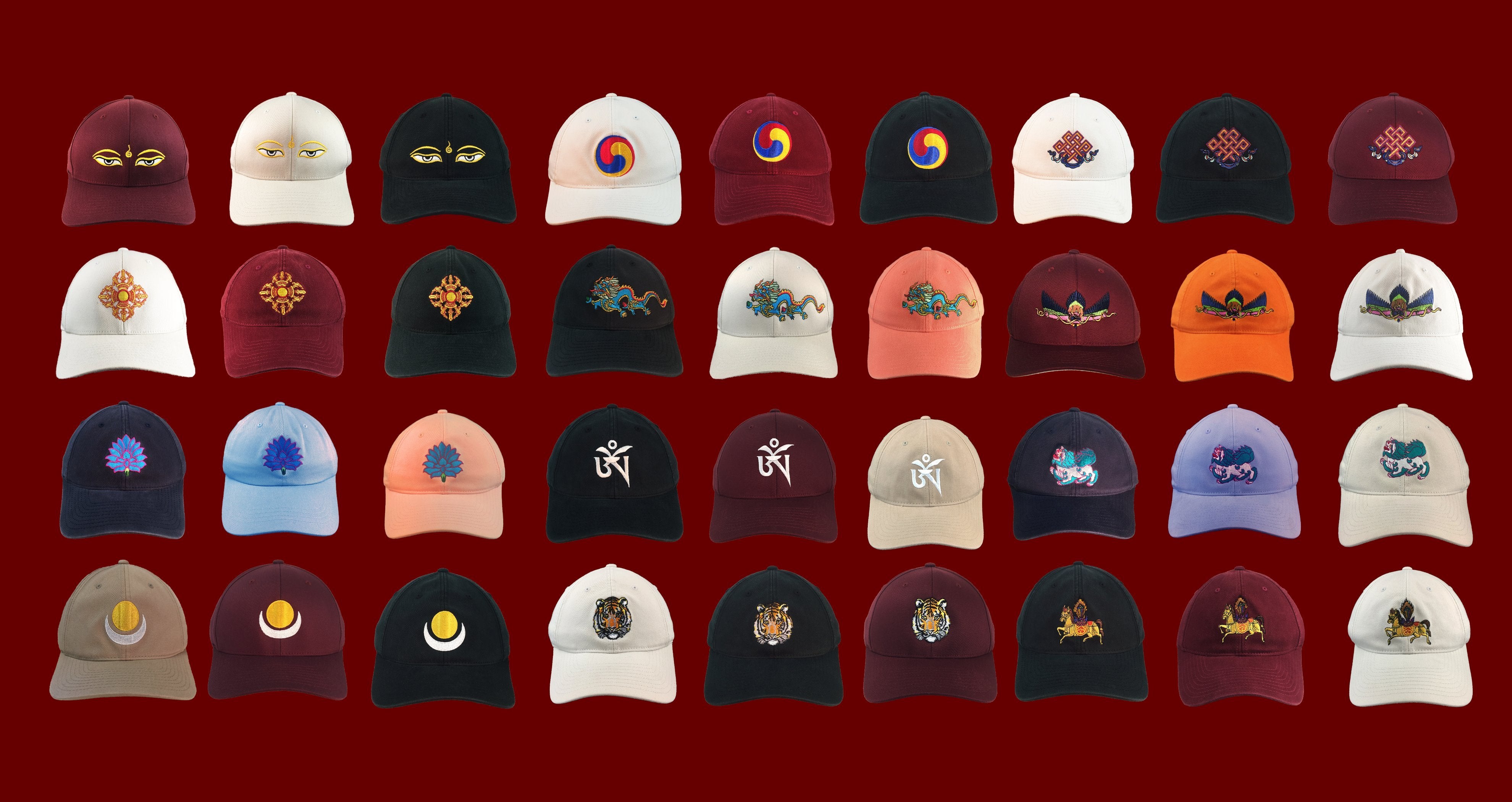 Our line of “Dharma Caps” combines beautifully embroidered auspicious symbols with the highest quality fitted caps. The caps display Tibetan Buddhist symbols. These ancient symbols represent aspects of Awakened Mind: Compassion, Wisdom, Power, etc. Since caps are worn on the highest part of the body we felt that displaying sacred emblems on them would honor the symbols’ meanings and would promote spiritual awareness, peace and harmony in the world. The explanations of the symbols on the caps can be seen on the product detail pages.