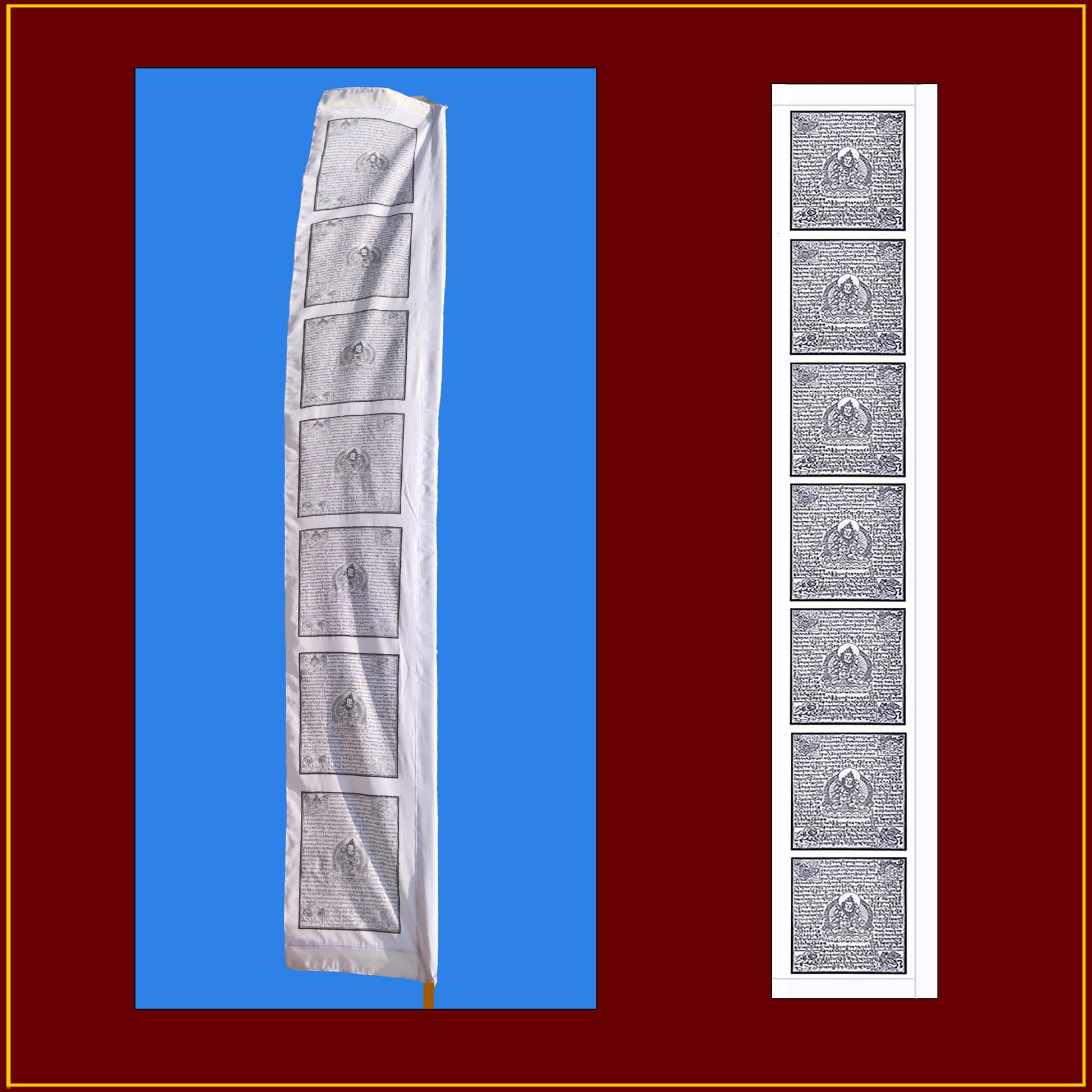 This flag raises good fortune by purifying negative karma. This 10 foot tall Bhutanese style prayer flag has seven repeated prints. They have Vajrasattva and consort in the center with the Four Dignities in the corners. There are prayers to the 5 Buddha Families, Vajrasattva, Manjushri, Avalokiteshvara, Vajrapani, Tara, and Guru Rinpoche along with repititions of Vajrasattva's hundred syllable mantra. This design appears on the white flags.