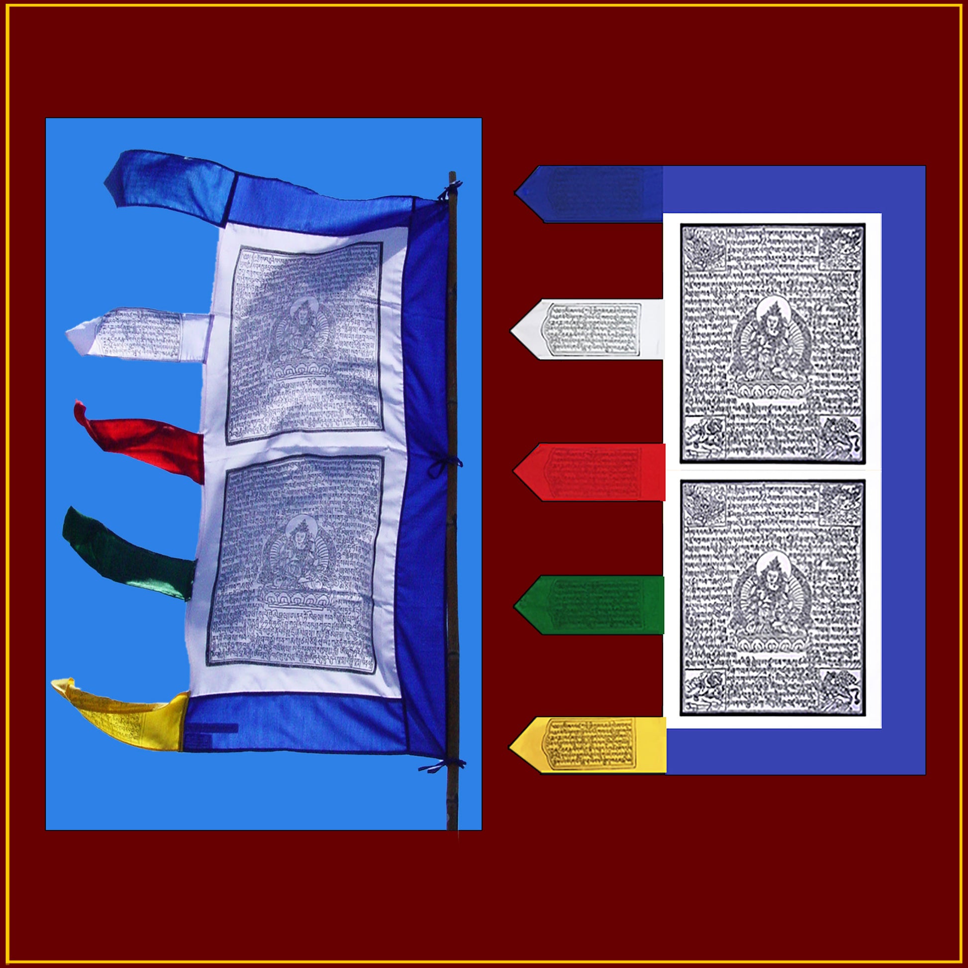 This 3'-4" tall Tibetan prayer flag has two prints with Vajrasattva (Dorje Sempa), the Buddha of Purification in the center of each print. He is surrounded by repitions of his 100 syllable mantra printed in Tibetan. This traditional prayer flag is woodblock printed with waterproof black ink on high quality white cotton cloth. It is hemmed on all edges. There are blue cloth borders on three sides and five multicolored streamers with prayer-increasing mantras on the fourth edge. There are both ties and a sleeve for attaching to the pole (not included). The flag is 3'-4" tall by 20" wide (plus the streamers). These prayer flags are designed, printed and sewn in our own studios in Kathmandu, Nepal.