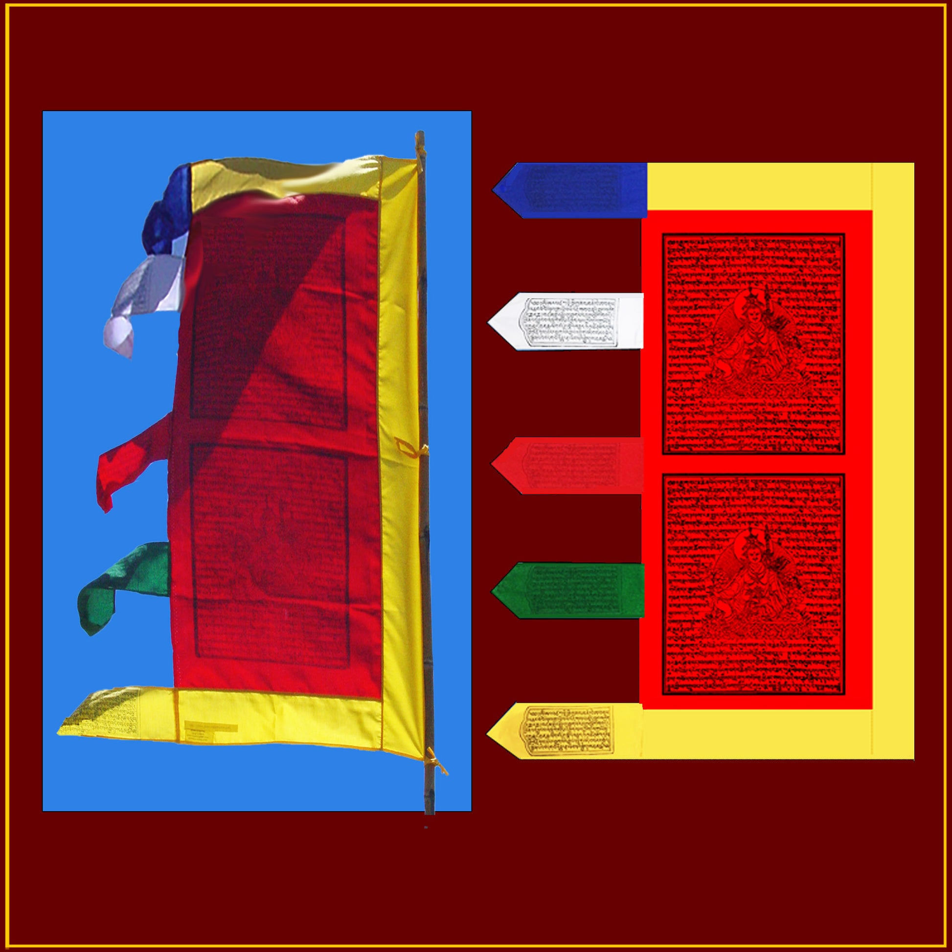 This 40” tall Tibetan prayer flag has two prints of Padmasambhava (Guru Rinpoche) surrounded by his Prayer of Spontaneous Accomplishment (Sampa Lhundrup) . This traditional prayer flag is woodblock printed with waterproof black ink on high quality red cotton cloth. It is hemmed on all edges. There are yellow cloth borders on three sides and five multicolored streamers with prayer-increasing mantras on the fourth edge. There are both ties and a sleeve for attaching to the pole (not included). The flag is 3'-4" tall x 20" wide (plus the streamers). These prayer flags are designed, printed and sewn in our own studios in Kathmandu, Nepal.