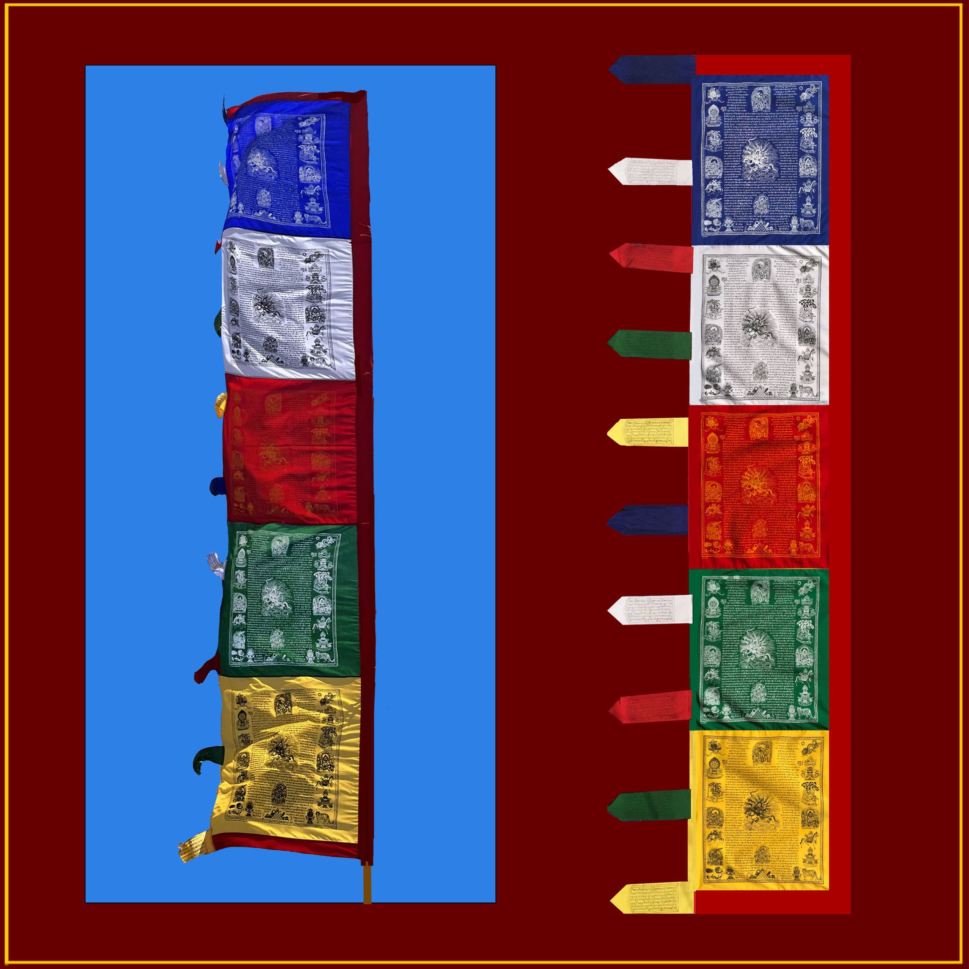 Gesar, the King of Ling, represents the principle of warriorship – not in the sense of war skills but in the sense of realizing the power, dignity and wakefulness that is inherent in all of us as human beings. The confident warrior conducts himself or herself with a gentle, fearless, and open-hearted intelligence in all aspects of life. Our traditional Ling Gesar flags depict King Gesar in the center – bearing his magical weapons and riding his winged steed Kyang Go Karka. The Supernatural Animals of the 4 directions (Garuda, Dragon, Tiger and Snow Lion) occupy the four corners. Their inner meanings represent exalted qualities of the human mind: fearlessness, dignity, confidence and unconditional cheerfulness. The text supplicates King Gesar and sings his praises. It contains mantras for overcoming obstacles and conquering enemies. King Gesar’s heroic task is to overcome the dark forces, both outer and inner, that bring war and hardship and obscure the spiritual path. Gesar’s ultimate victory promises that peace, harmony and enlightenment will prevail in the world. Material: High quality cotton, hemmed on all sides and on the tongues. There is a sleeve and ties for attaching to a pole. The size is 28" (plus 11" streamers) x 150" (12 ft - 6 in).
