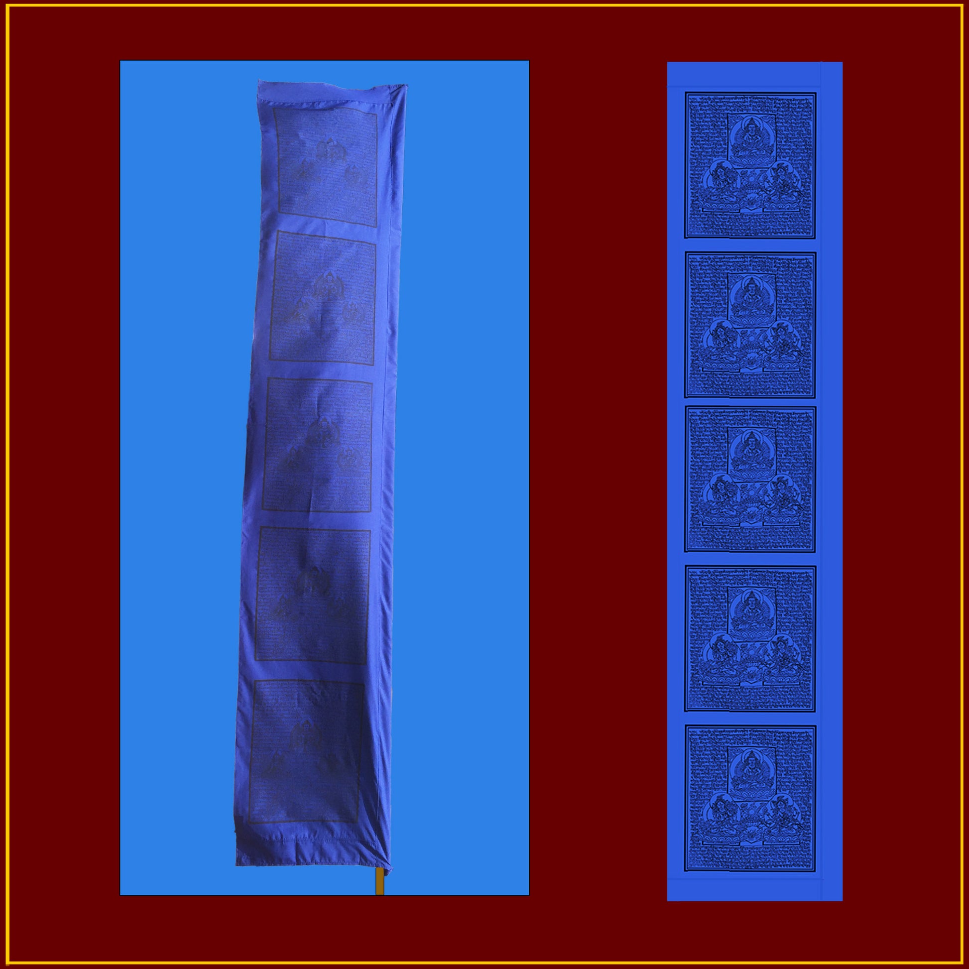 This 7'-3" tall 18' wide Bhutanese style prayer flag has five "Tsa La Nam Sum" prints portraying the main deities of Health and Longevity: Amitayus (Buddha of limitless life), White Tara (peace & health), and Vijaya (victorious protection). The figures are surrounded by the "Tsa La Nam Sum" Sutra for Long Life printed in Tibetan. This traditional prayer flag is woodblock printed with waterproof black ink on high quality blue cotton cloth. There is a double-folded blue border along the pole edge, creating a sleeve, open at the bottom and closed at the top, that can be slipped over the pole. There are also cloth ties along the pole edge that can be used to tie to the pole or can be cut off with scissors if you prefer to use the sleeve option. The other three sides of the prayer flag are also hemmed.