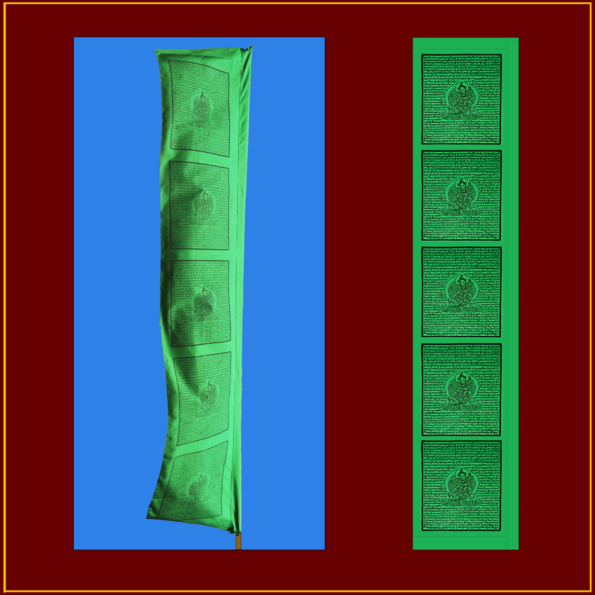 This 10 foot tall Bhutanese style prayer flag has five prints of Green Tara representing the active energy of compassion- the mother who offers aid and protection. The surrounding text is a short version of the Invocation to the 21 Taras - each portraying a different aspect of Compassion. This print appears on the green vertical flags and flags on rope.