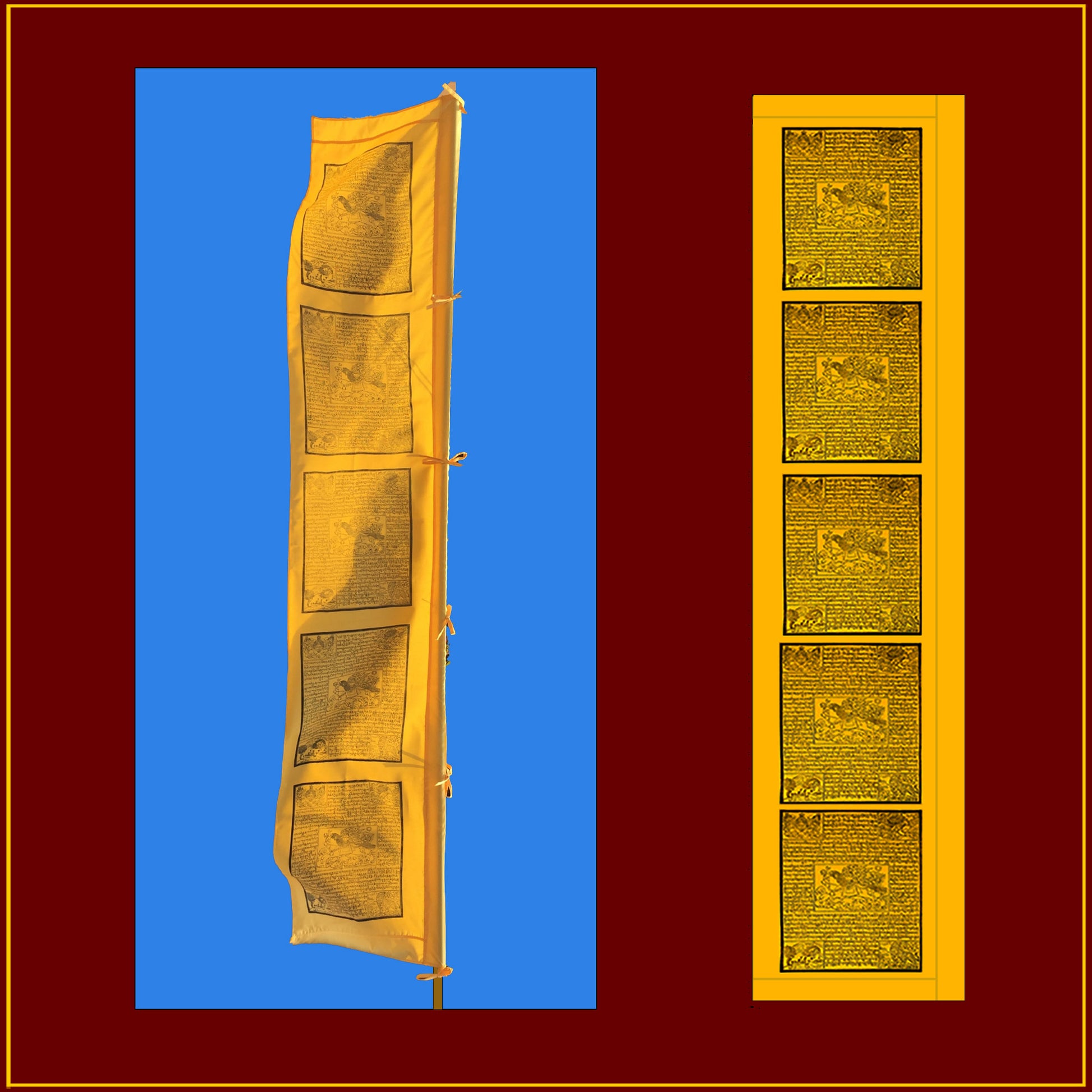 This 7'-3" tall Bhutanese style prayer flag has five prints. In the center of each print is a Windhorse, the symbol of "Good Fortune Energy." It is surrounded by the Victory Banner Sutra (Gyalstan Semo). In the corners of the print are drawings of the “Four Dignities” (dragon, garuda, snow lion, tiger). This traditional prayer flag is woodblock printed with waterproof black ink on high quality yellow cotton cloth. There is a double-folded yellow border along the pole edge, creating a sleeve, open at the bottom and closed at the top, that can be slipped over the pole. There are also cloth ties along the pole edge that can be used to tie to the pole or can be cut off with scissors if you prefer to use the sleeve option. The other three sides of the prayer flag are also hemmed.