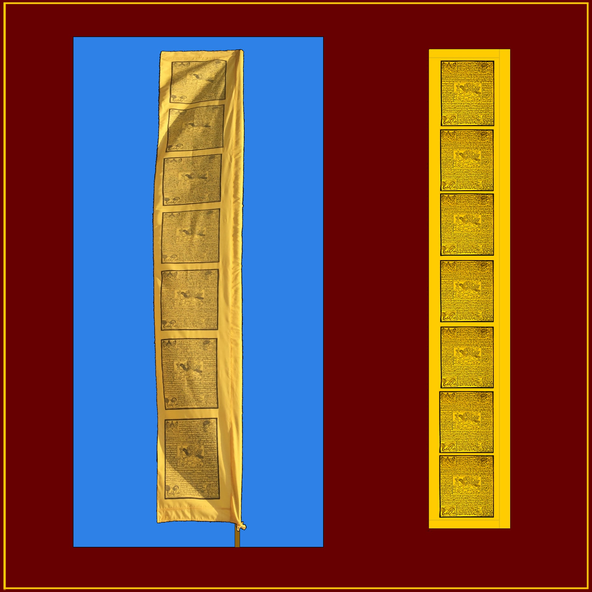 This 10 foot tall Bhutanese style prayer flag has seven prints. In the center of each print is a Wind Horse, the symbol of "Good Fortune Energy." It is surrounded by the Victory Banner Sutra (Gyalstan Semo). In the corners of the print are drawings of the “Four Dignities” (dragon, garuda, snow lion, tiger). This traditional prayer flag is woodblock printed with waterproof black ink on high quality yellow cotton cloth. There is a double-folded yellow border along the pole edge, creating a sleeve, open at the bottom and closed at the top, that can be slipped over the pole. There are also cloth ties along the pole edge that can be used to tie to the pole or can be cut off with scissors if you prefer to use the sleeve option. The other three sides of the prayer flag are also hemmed.