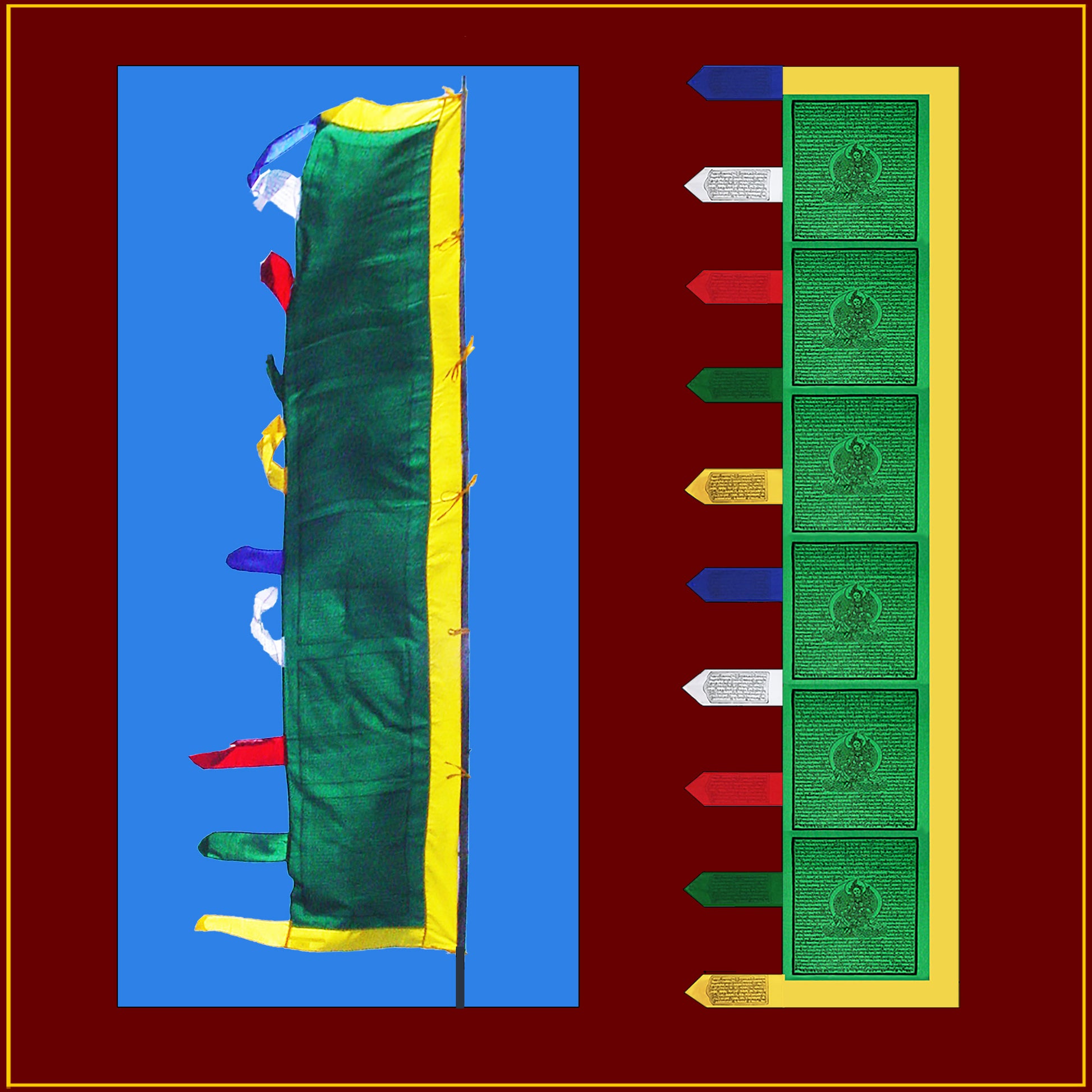 This 9' long Tibetan prayer flag has six prints with Green Tara in the center surrounded by the prayer "Praises to the 21 Taras" and her mantra "O TARE TU TARE TURE SOHA." This traditional prayer flag is woodblock printed with waterproof black ink on high quality green cotton cloth. It is hemmed on all edges. There are yellow cloth borders on three sides and ten multicolored streamers with prayer-increasing mantras on the fourth edge. There are both ties and a sleeve for attaching to the pole (not included). The flag is 9'tall x 20" wide (plus the streamers). These prayer flags are designed, printed and sewn in our own studios in Kathmandu, Nepal. An explanation label is included in the package.