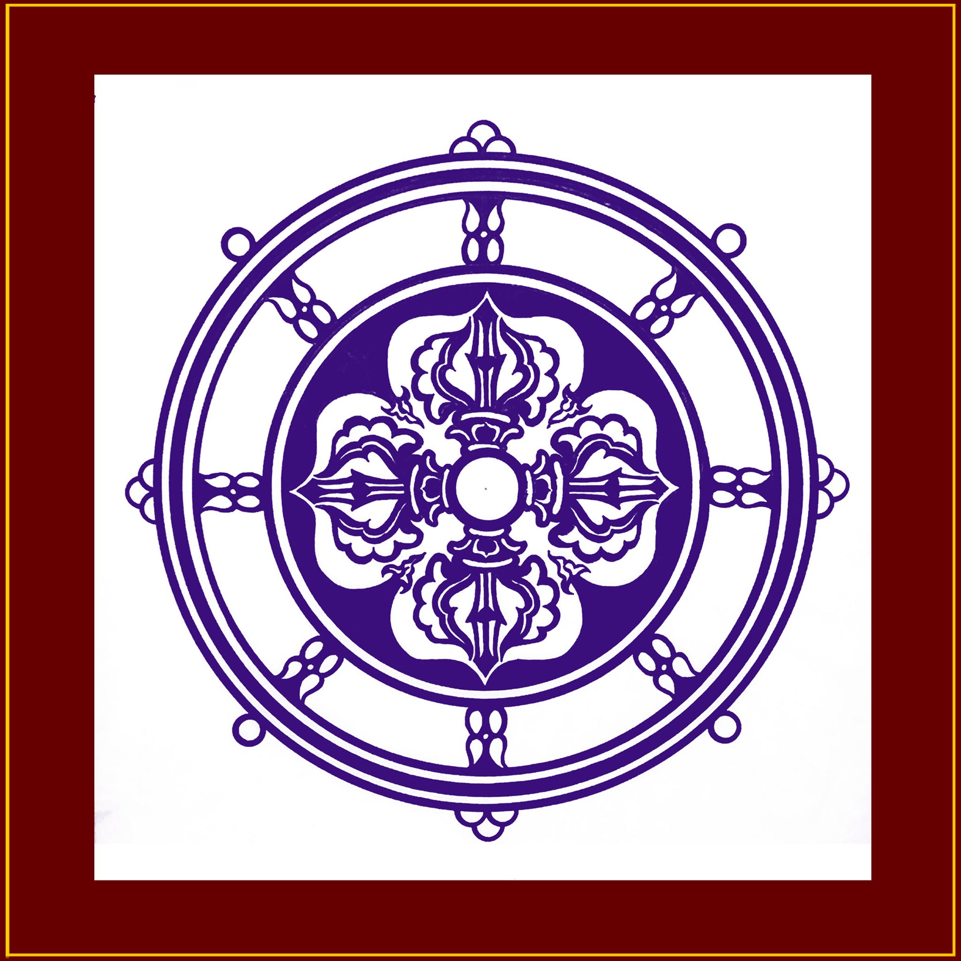 The Dharma Chakra is the Symbol of Universal and Spiritual Law. Its spokes represent the Noble Eight-Fold Path. In the center is a Double Dorje, the adamantine symbol of sovereign power and indestructible mind.