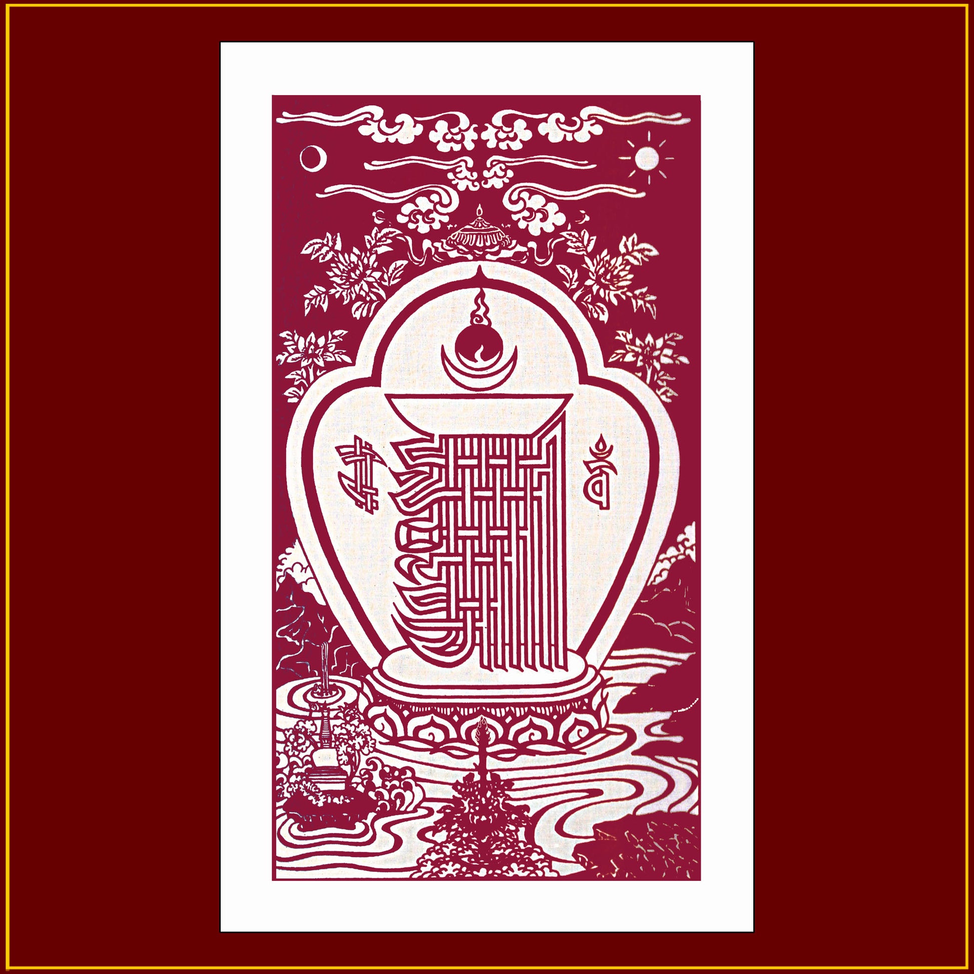 This symbol, in monogram form, contains the seed syllables of the Kalachakra Heruka. It represents the essence of the teaching of the Kalachakra Tantra concerning the energy which transcends the relative concepts of time and space. These "Ten Syllables of Power" represent the 84,000 teachings of enlightenment.