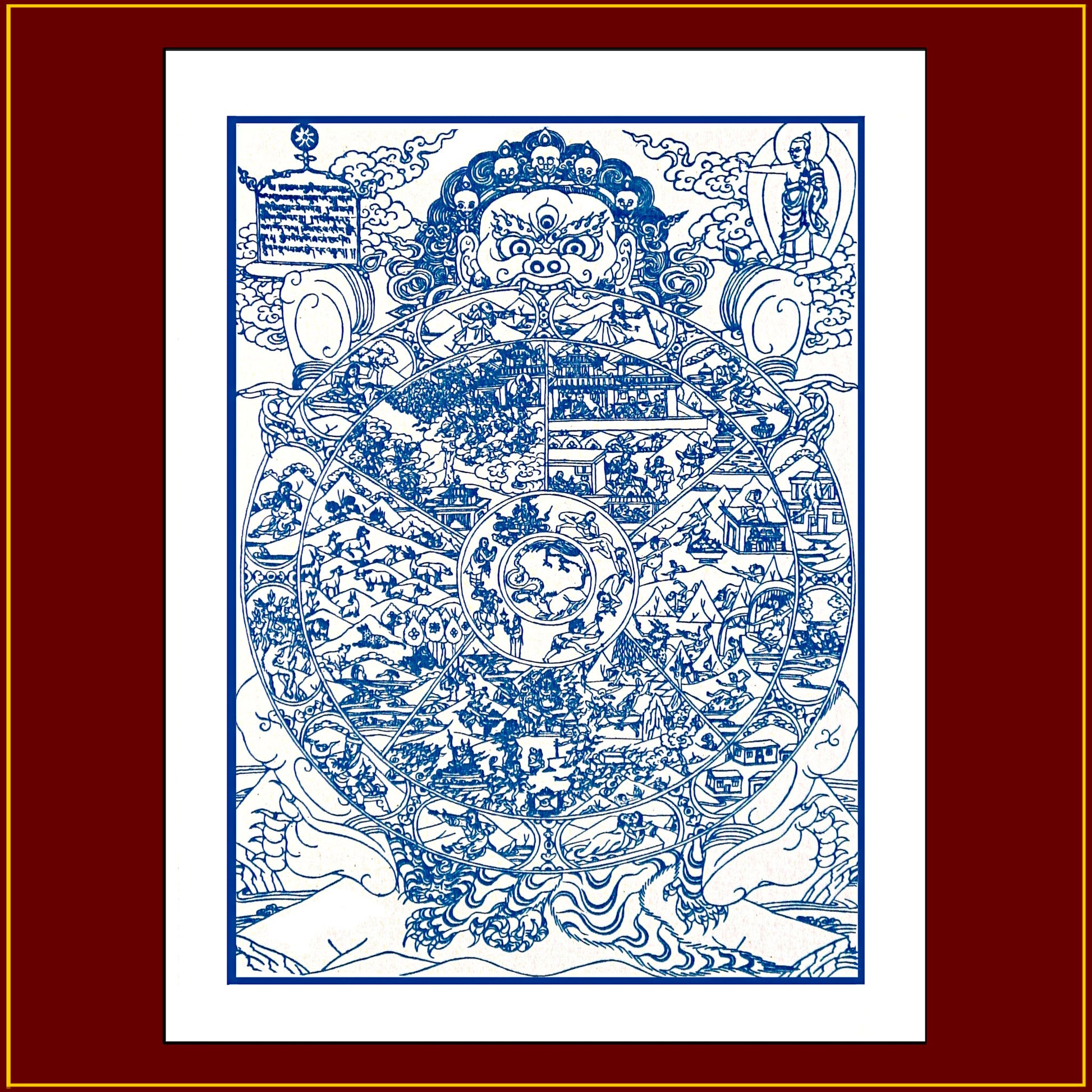 This traditional print depicts the cycle of worldly states of existence. The pictorial forms symbolize the self-perpetuating process of delusion. At its center are the animals representing the root causes of conditioned existence: ignorance, desire, and aversion. The next ring depicts the successive rising and falling action of Karma. Sentient beings revolve endlessly among the Six Realms, shown in the large middle circle (God, Ausura, Human, Animal, Hungry Ghost and Hell). The outermost circle depicts the twelve phases of dependent origination (nidanas), links in the causal chain of cause and effect which governs existence. The entire Wheel of Life is in the grasp of Yama, Lord of Death. At the upper right, away from the endless circle stands a Bodhisattva who points toward another wheel: the Wheel of Dharma, representing the teachings of liberation.