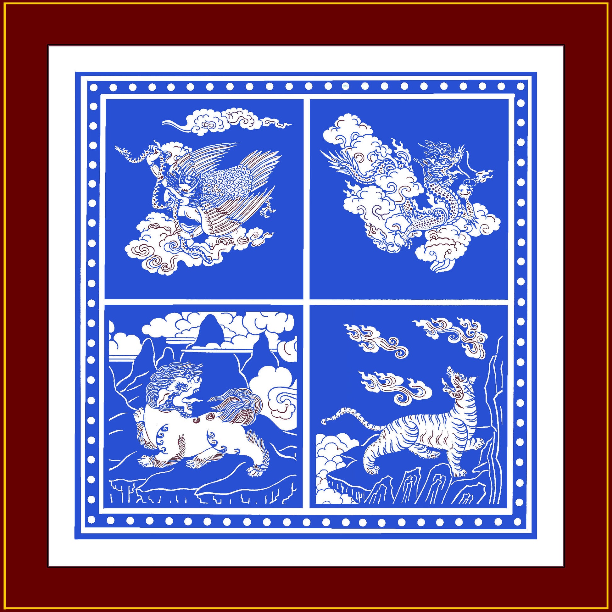 These Four Auspicious Animals: the Garuda, the Sky Dragon, the Snow Lion, and the Tiger, are seen in the corners of many Tibetan prayer flags. Known collectively as "The Four Dignities," they represent sacred qualities and attitudes that Bodhisattvas develop on the path to enlightenment; qualities such as confidence (Tiger), clear awareness (Snow Lion), fearlessness (Garuda), and gentle power (Dragon).