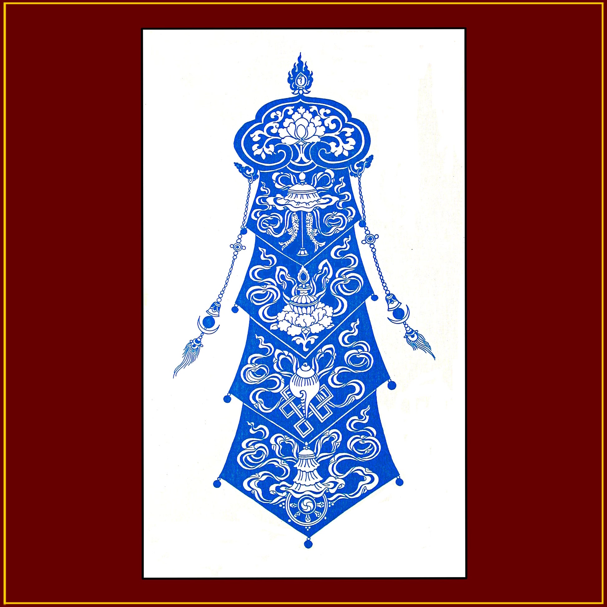 Print Size: 10"x 19" The Eight Auspicious Symbols, Tashi Targye, are shown here in the form of a long banner. From top to bottom: 1. White Umbrella - protects from all evil 2. Golden Fish - happiness, beings saved from the sea of suffering 3. Vase - containing the nectar of immortality 4. Lotus - purity and spiritual unfoldment 5. Conch Shell - proclaims the teachings of the enlightened ones 6. Knot of Eternity - the meditative Mind 7. Victory Standard - proclaims the victory of Buddhism 8. Dharma Wheel - symbol of spiritual law.