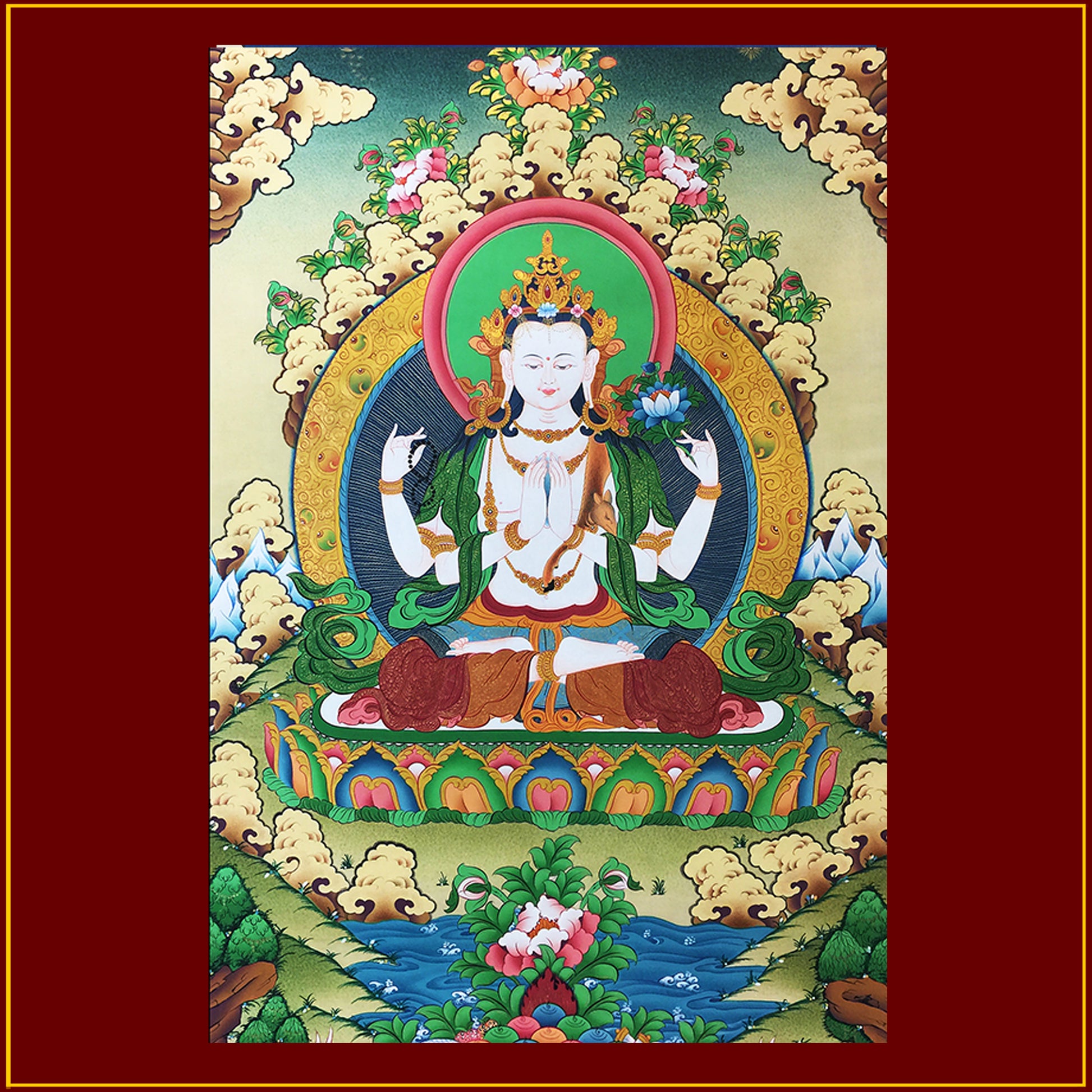 Avalokiteshvara, is the supreme embodiment of compassion and the personification of the bodhisattva ideal. This name means “lord who gazes down at the world.” He is the helper of all sentient beings in the 6 realms (god, jealous god, human, animal, hungry ghost, hell). In Tibet, he is called Chenrezig, and his mantra, OM MANI PADME HUM, is widely repeated by most Tibetans. This main form of Avalokiteshvara is shining white and has 4 arms. His two primary hands hold the jewel of enlightenment that fulfills all wishes. His 2nd right hand holds a crystal rosary, representing the tirelessness of his compassion, and in his left hand is a lotus of purity. The Dalai Lama and Gyalwa Karmapa are said to be his incarnations. He is shown here in the midst of his snow mountain paradise called "Potala" after which the Dalai Lama's palace in Lhasa was named.