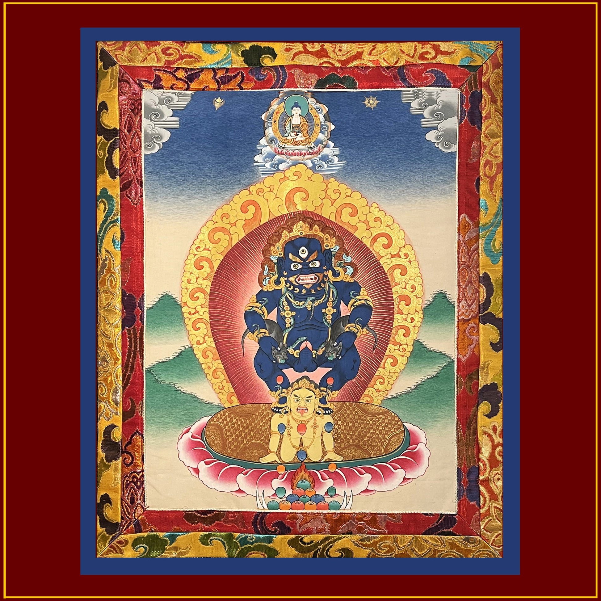 This thankga depicts Black Dzambala enthroned upon a semi-wrathful yaksha, a nature spirit traditionally associated with wealth, treasures, and the guardianship of hidden riches. Yakshas are also known for being capricious, greedy, or even violent. Its presence beneath Dzambhala reflects how the worldly sources of prosperity — material resources, fertile lands, hidden treasures — are brought under the control of enlightened compassion. Instead of being chaotic or harmful, that power is redirected toward the benefit of beings.