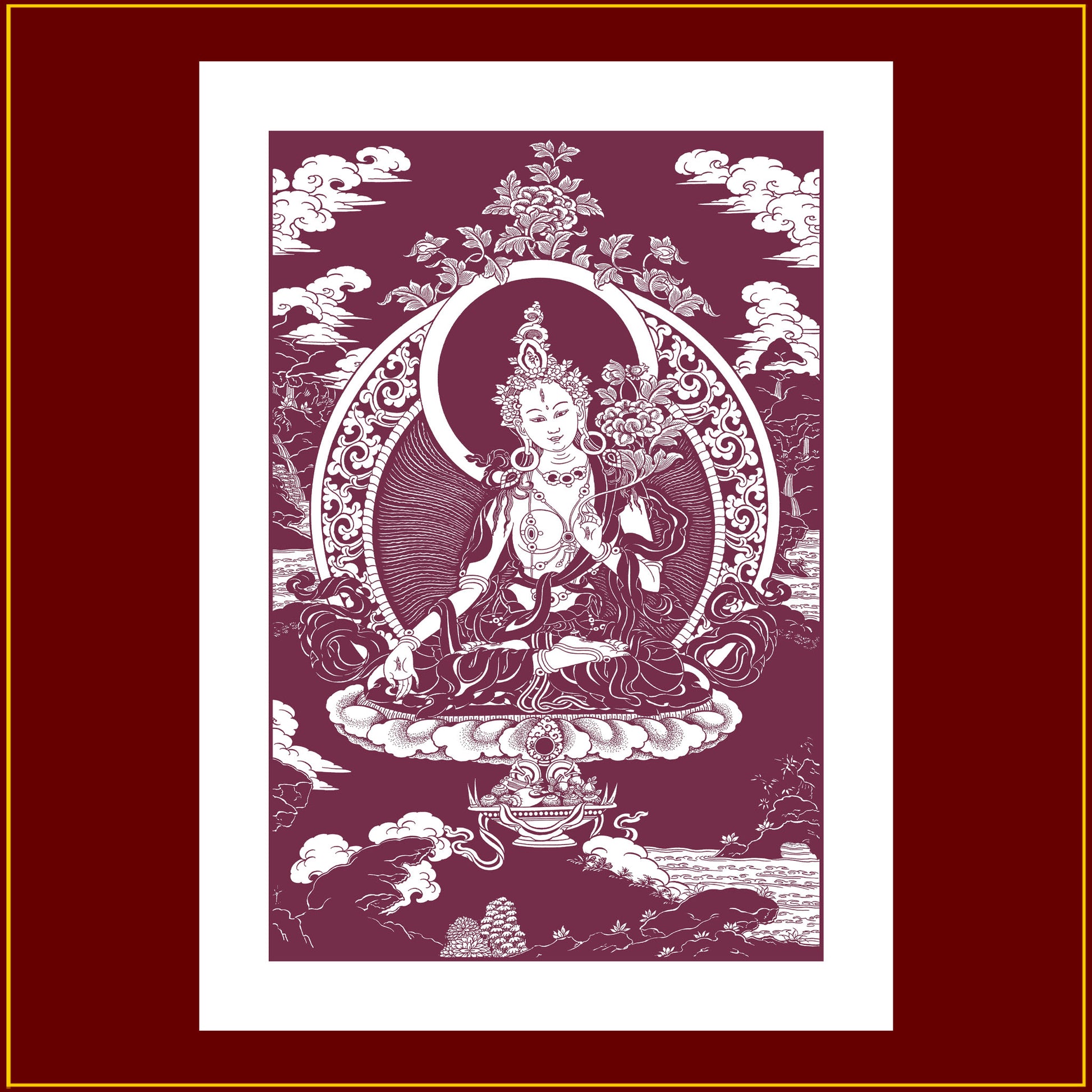 This print on cotton fabric depicts White Tara, the Mother of all the Buddhas. She represents the motherly aspect of compassion. Her seven eyes (three on her face, one on the palm of each hand, and one on the sole of each foot) symbolize the vigilance of her compassion. Seated in the meditation posture, her right hand is in the gesture of supreme generosity and her left holds the lotus of compassion with the mudra of the three jewels (Buddha, Dharma, Sangha). White Tara brings the devotee long life and protects against all dangers. This print is suitable for both indoor and outdoor locations.