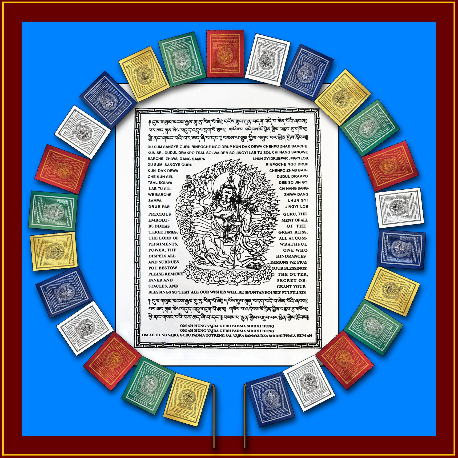This is prayer flag depicts the semi-wrathful form of Guru Rinpoche (Padmasambhava) in the center surrounded by the special prayer called “Du Sum Sangye” (The Buddhas of the Three Times). This widely practiced powerful prayer was written by Guru Rinpoche (Padmasambhava). It invokes his blessings as the embodiment of all the Buddhas of the three times. It is a supplication for purification, protection, and the removal of obstacles. By invoking Guru Rinpoche in this form, his enlightened presence swiftly dispels negativity, fear, disease, and harmful influences. Used in times of natural disasters, wars, uncertainty, or difficulties, it brings protection, courage, and the removal of obstacles.
