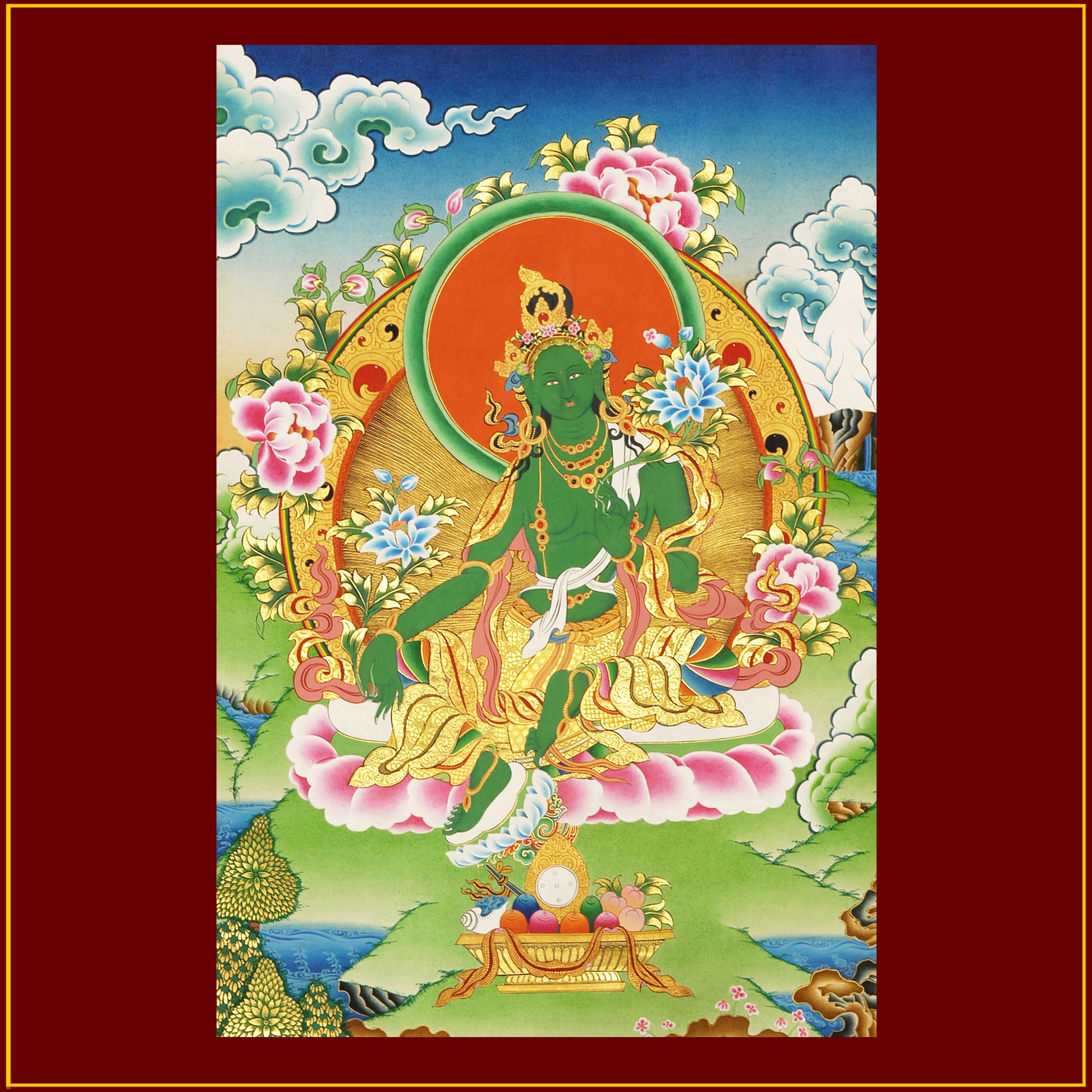 Green Tara is the active and energetic aspect of compassion. She is the national goddess of Tibet. Revered as the miraculous savioress who rescues all beings from suffering, she is propitiated in order to overcome obstacles. Green Tara is honored as the Mother of the Buddhas of all three times - the Bodhisattva who represents the miraculous activity of all the Buddhas of the past, present, and future. She is usually shown in a posture of ease and readiness for action. Her left leg is folded in the contemplative position and her right leg is outstretched, ready to step down from her lotus throne to offer comfort and protection. Her left hand is in the protection mudra; her right hand makes the wish-granting offering gesture. In her hands she holds blue lotuses), which symbolize purity and power.