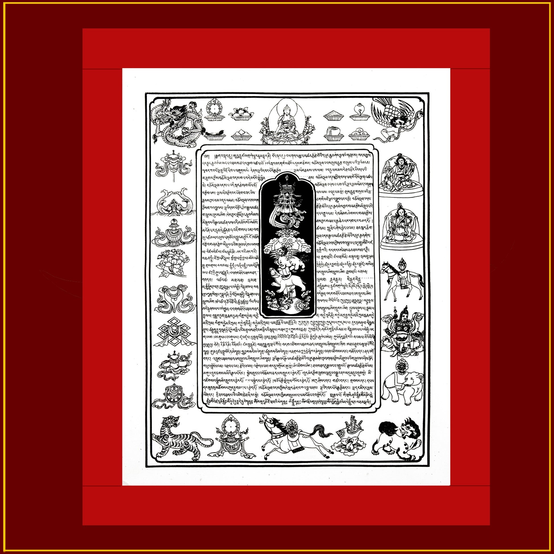 The sutra printed on this Banner of Victory was imparted to Indra, King of the Gods, by the Buddha Sakyamuni. Facing defeat by the Asuras, Indra was instructed to repeat this sutra in order to achieve victory over all obstacles and enemies. This exquisitely drawn traditional Tibetan Prayer flag portrays the "Four Dignities" in the corners. On the left side are the Eight Auspicious Symbols and down the right side are the eight precious possessions of a Monarch (minister, queen, wish fulfilling jewel, vase, horse, general, golden wheel elephant). At the bottom of the banner is the Wind Horse of good fortune among the five sensuous offerings. At the top center sits Sakyamuni Buddha in subduing pose surrounded by the eight glorious offerings. The composite creatures depicted in the center of the banner symbolize peace and harmony in the union of Opposites. Above them flies the glorious Banner of Victory. The 2" red cloth border is double-folded and hemmed. The borders at the top and bottom are open at the ends, so that a rod or dowel can be inserted for hanging.