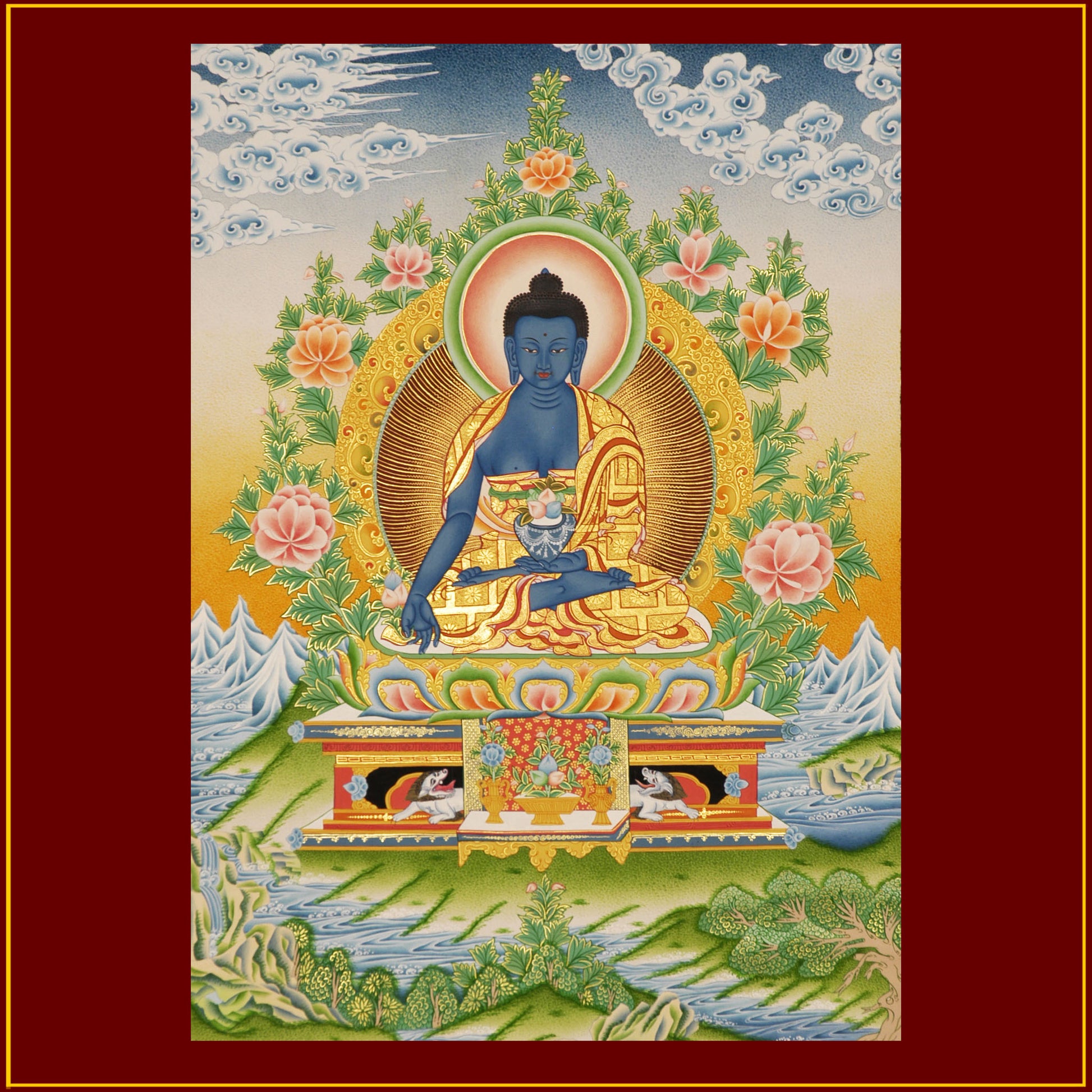 The Medicine Buddha is depicted here wearing the 3 robes of a Buddhist Monk, holding a lapis-colored bowl of medicinal nectar and herbs in his left hand and the right hand resting on his right knee in the gesture of fearlessness, holding the stem of the medicinal Aruna fruit (Myrobalan).
