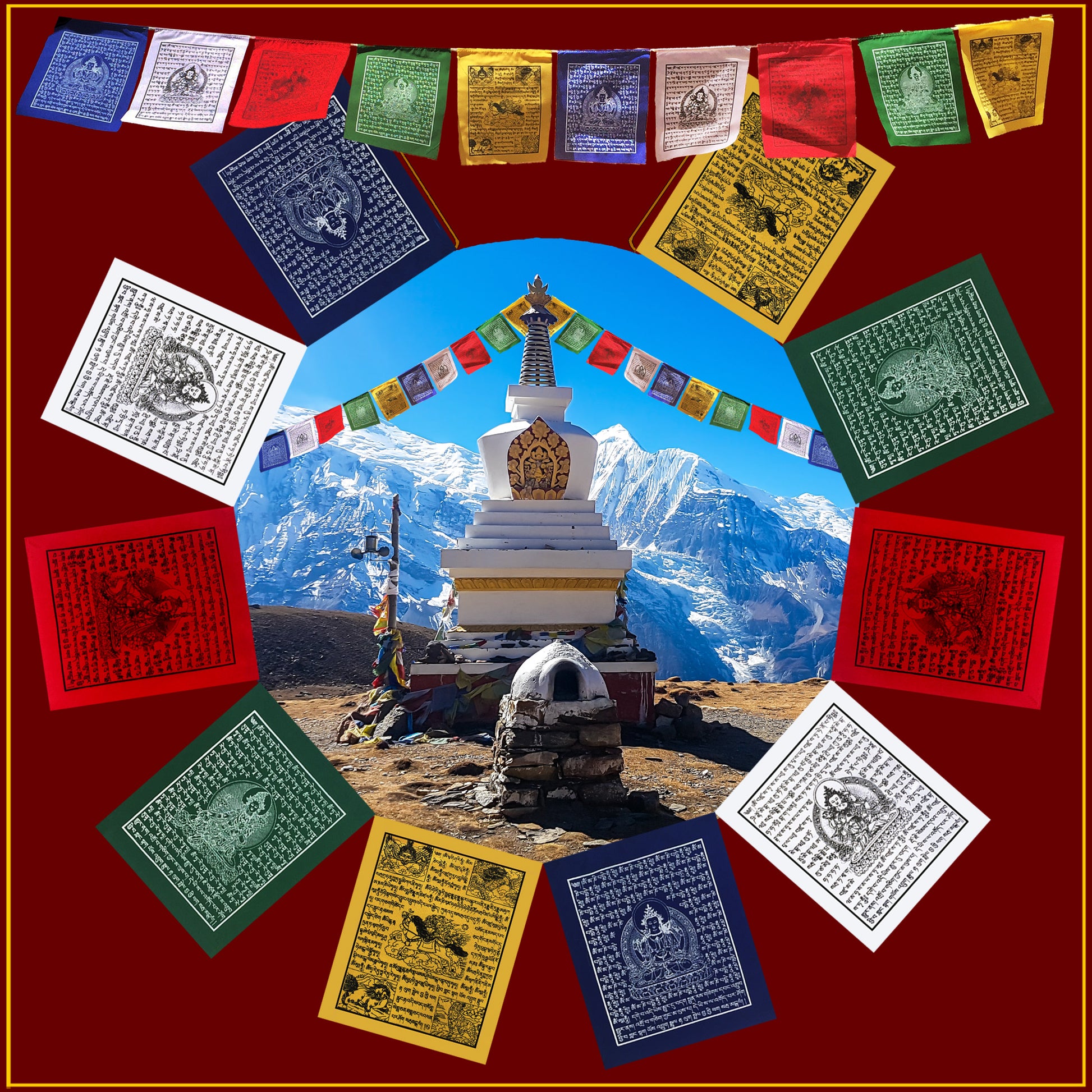We call these small flags “mini flags" not because they are tiny but because they're smaller than our other prayer flags. Each flag measures 6 in. X 8 in. They are silk screen printed with black or white ink in 5 designs; each design on a different color cloth: