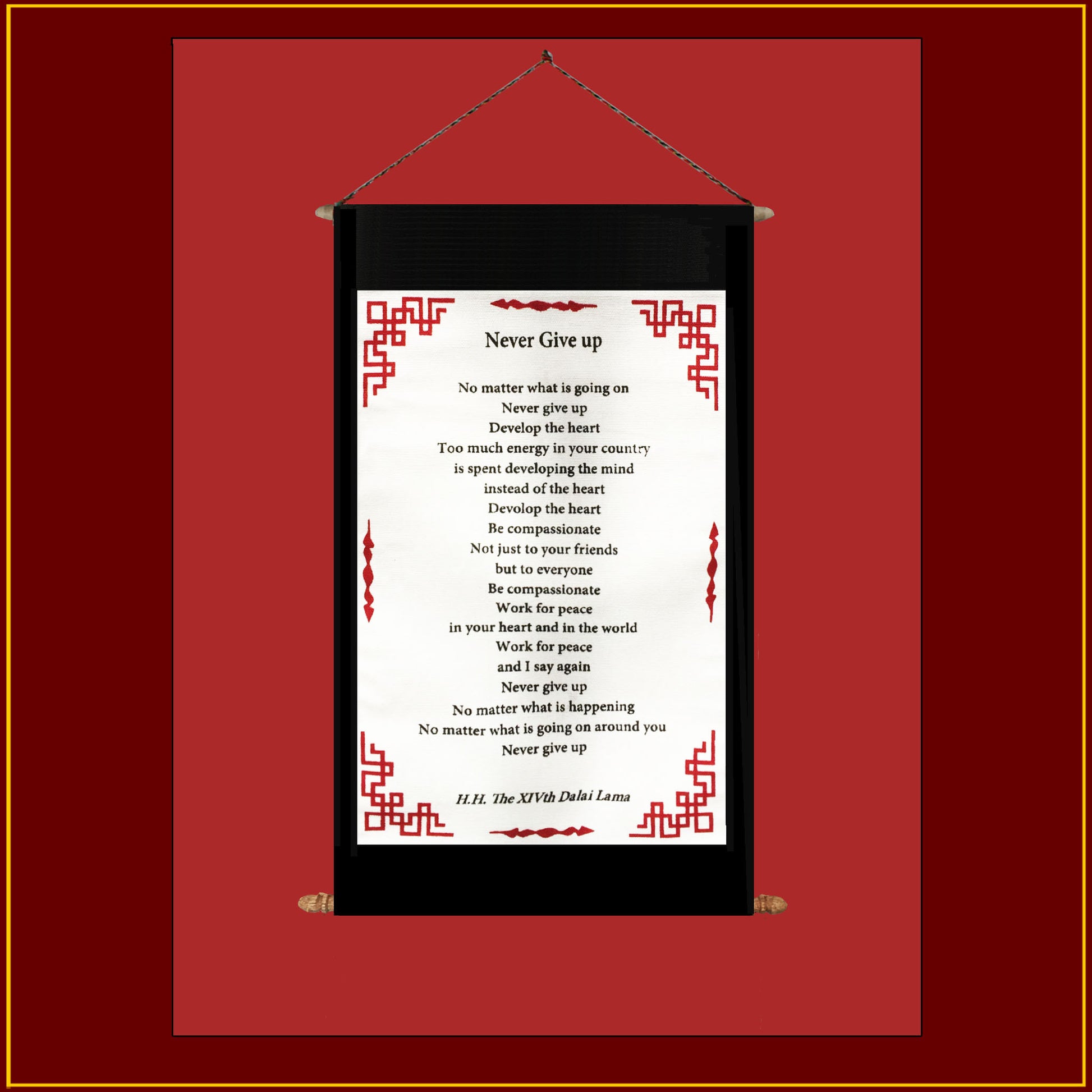 This 9"x 16" cloth scroll has a short teaching called "Never Give Up," by H.H. the14th Dalai Lama.