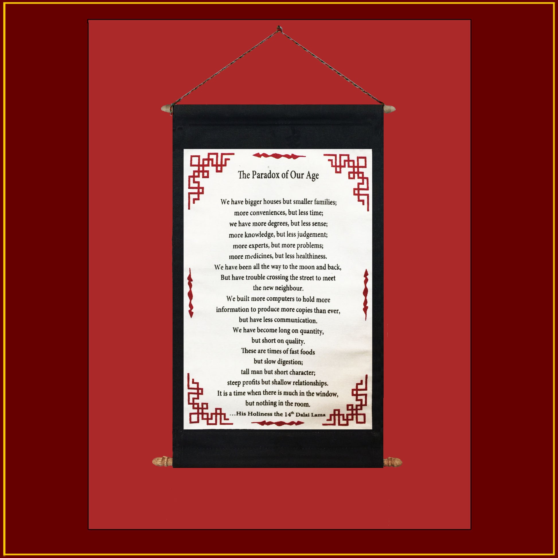 This 9"x 16" cloth scroll has a quotation called "The Paradox of Our Time," by HH the 14th Dalai Lama: