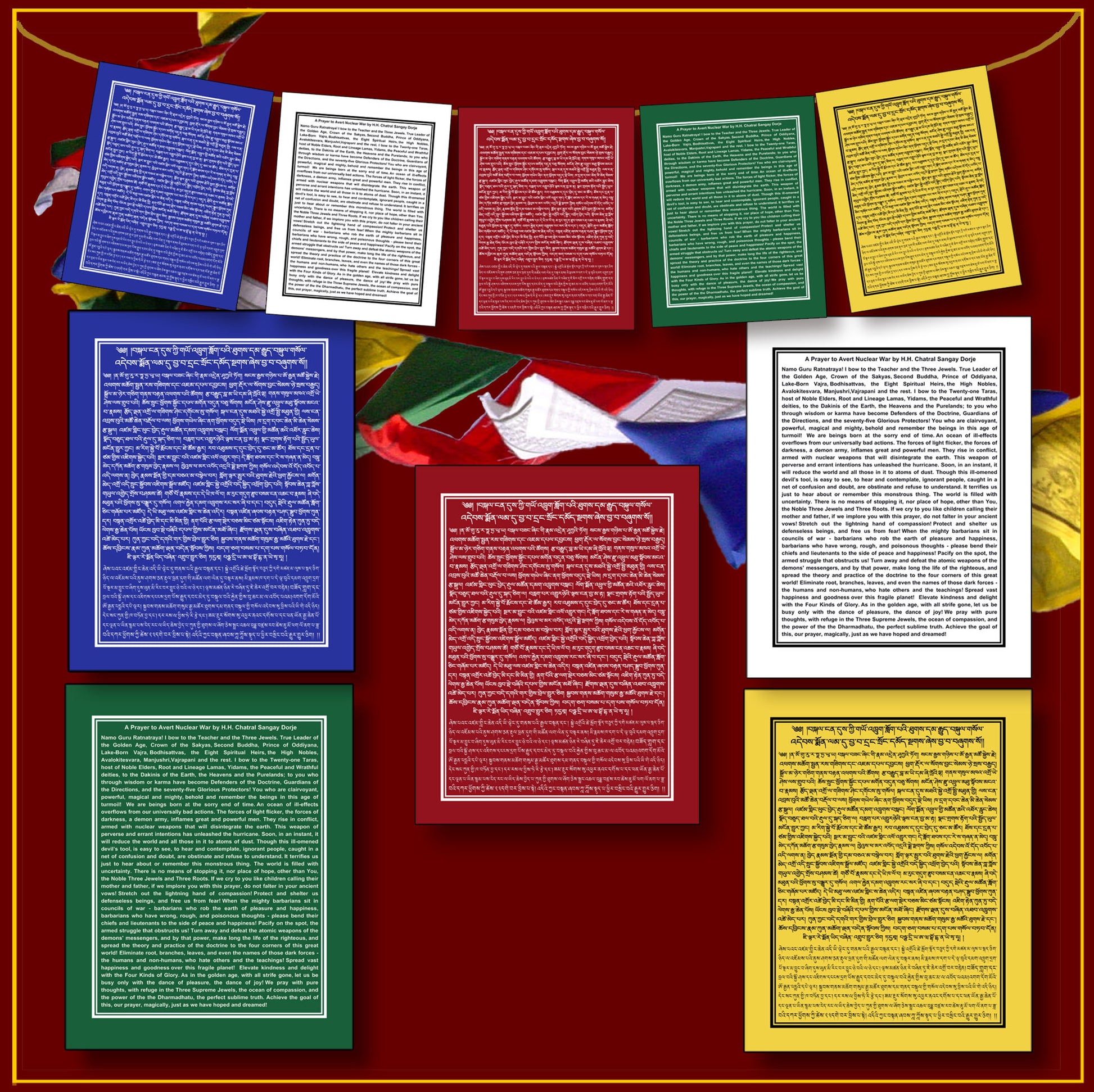 The threat of nuclear war is one of the greatest threats to our existence. Many Tibetan Lamas have commented on this. The Dzogchen Master, H.H. Chatral Sangay Dorje (1913-2015), a most accomplished Tibetan Buddhist Yogi, wrote this special prayer to avert nuclear war. Chatral Rinpoche's spiritual consort, Sangyum Kamala, asked us to make these flags available. They need to be flown in great numbers all around the world.