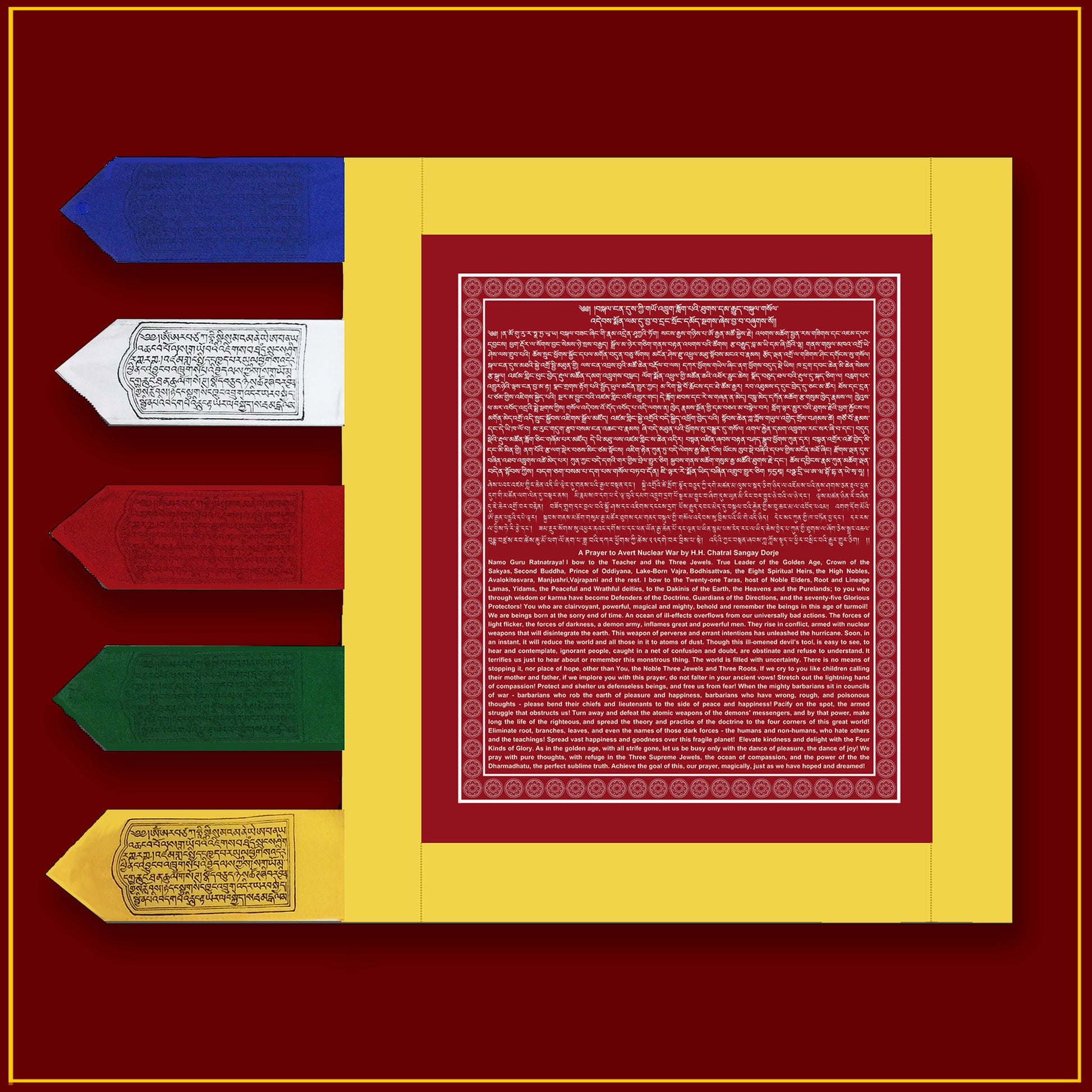 A Prayer for Averting Nuclear War is written in both Tibetan and English on this 26"X27" prayer flag. The Dzogchen Master and accomplished Tibetan Buddhist Yogi, H.H. Chatral Sangay Dorje (1913-2015), wrote this special prayer to avert nuclear war. Chatral Rinpoche's spiritual consort, Sangyum Kamala, asked Radiant Heart Studios to design prayer flags with this prayer and make them available. Displaying them in great numbers all around the world will help to counteract the nuclear threat.