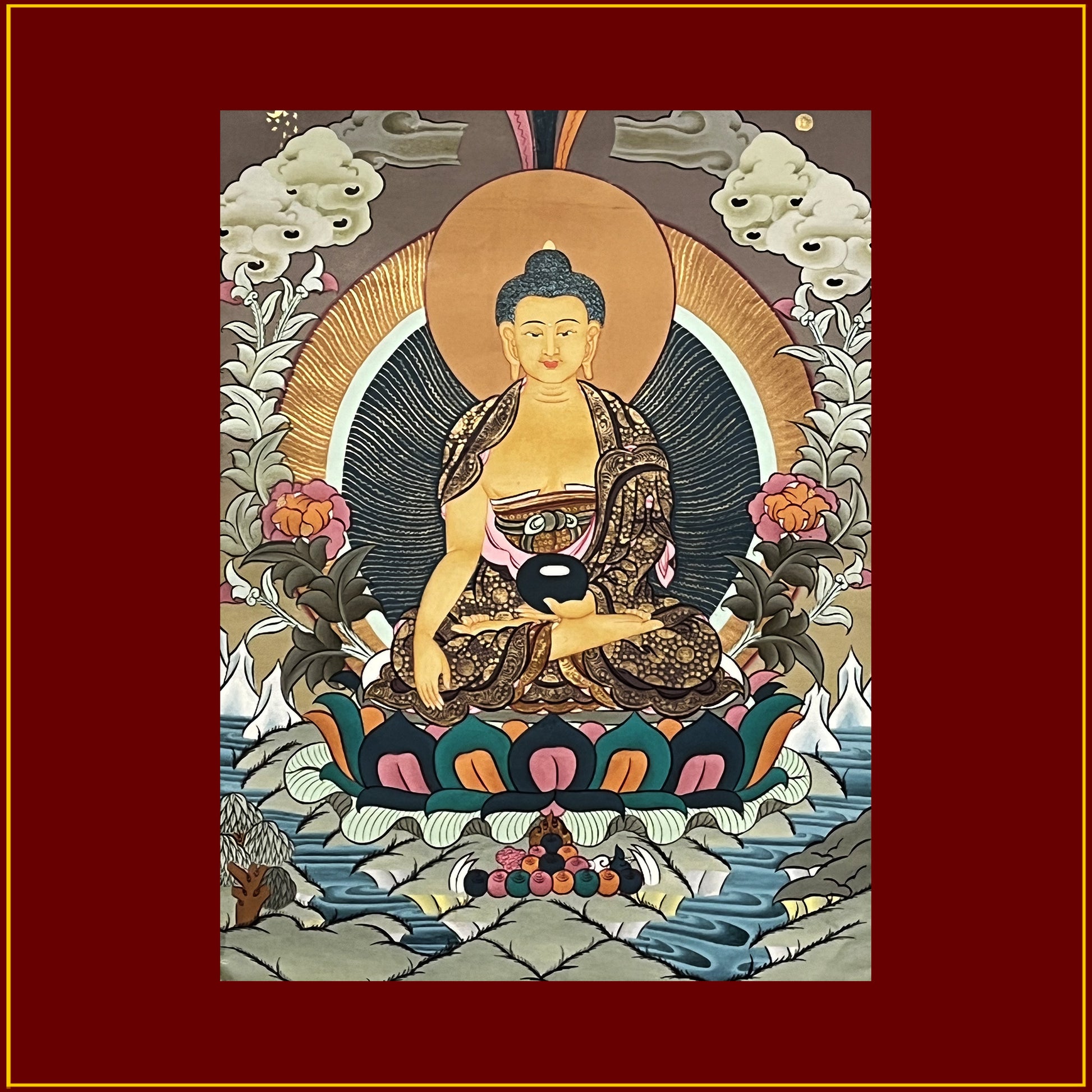 This is a small hand-painted traditional thangka showing Shakyamuni Buddha in Earth-Touching mudra, calling the earth to witness at the moment of enlightenment. For a small painting, it's nicely executed with muted colors in the landscaping, a beautiful face and detailed decoration in the robes.