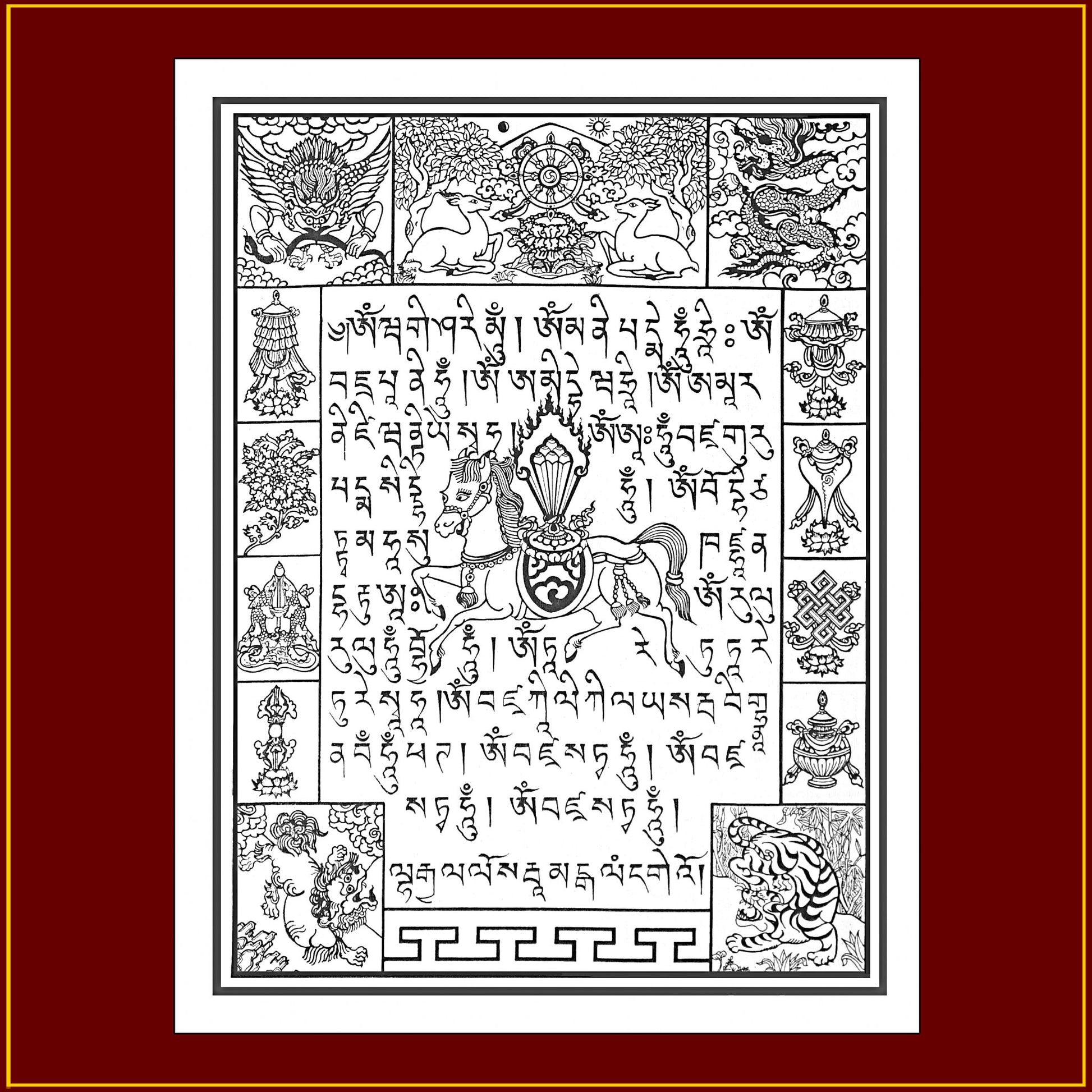 The traditional Wind Horse Prayer Flags are ancient designs. In the center of the flag is the Wind Horse, the uplifting energy that carries good fortune to all beings. In the corners are the "Four Dignities": the Garuda (wisdom), the Dragon (gentle power) the Snow Lion (fearless joy), and the Tiger (confidence). The Eight Auspicious Symbols (See S-1) are depicted around the perimeter. Various prayers and mantras are included in the text. The Wind Horse carries the wish fulfilling jewel of enlightenment. At the top is a symbolic representation of the Buddhas's first teaching at Deer Park. The text inscribes the mantras of many deities: Manjushri, Avolokiteshvara, Vajrapani, Amitabha, Amitayus, Padmasambhava, The Peaceful Deities, the Wrathful Deities, Tara, Vajrakilaya, and Vajrasattva.