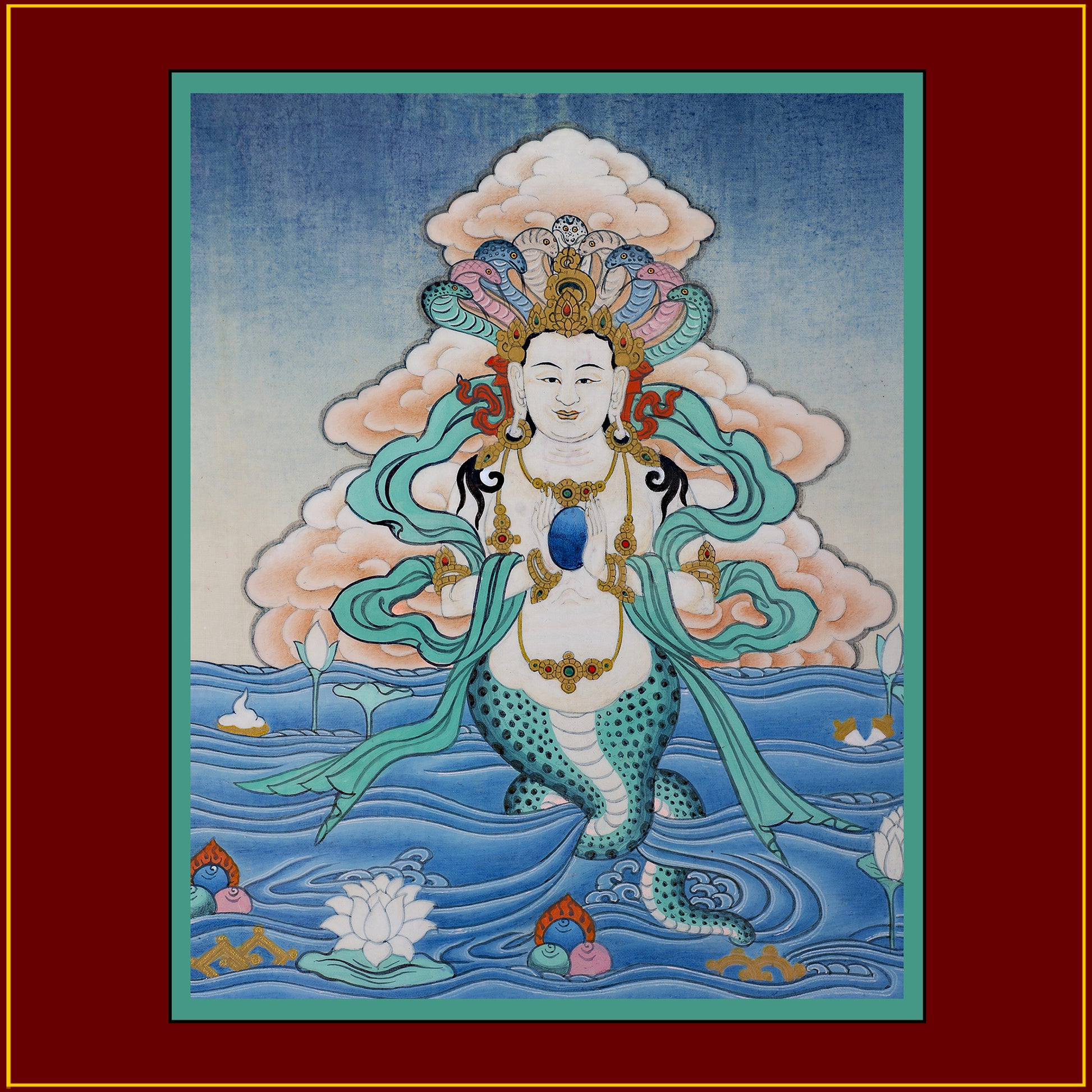 This painting was given to me by my teacher, Acharya Lama Dawa Chhodak. He instructed me to put it inside the Naga Palace (Lukhang) that we were building on my land in Northern California. Nagas are elemental beings associated with the water element. They guard the earth's treasures and many Buddhist texts.