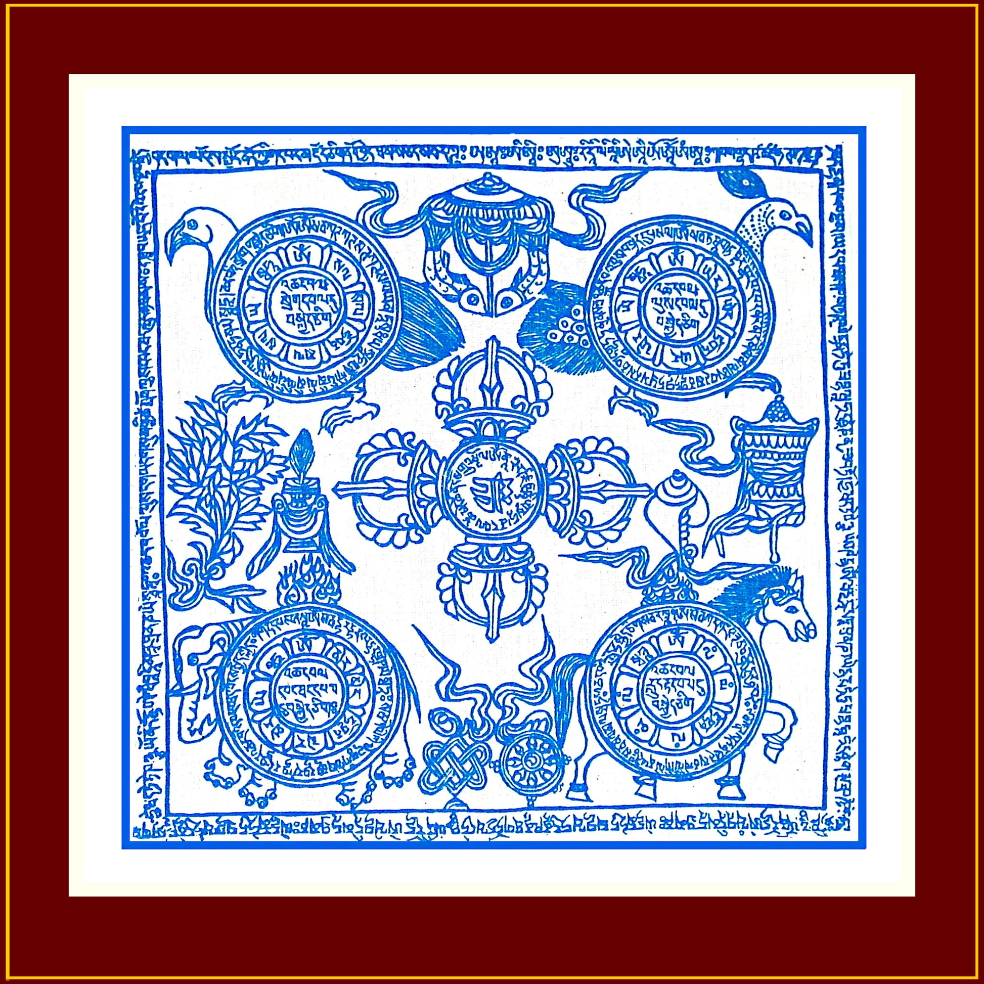This is a traditional Tibetan prayer flag with a double dorje in the center where it is written "May the holder of this charm be given the gift of eternal life." In the corners are the garuda, the peacock, the elephant, and the wind horse with mantras to protect and increase life, health, wealth and good fortune. The Eight Auspicious Symbols are depicted between the lotus mantra discs. Around the edge are inscribed protection and increasing prayers.