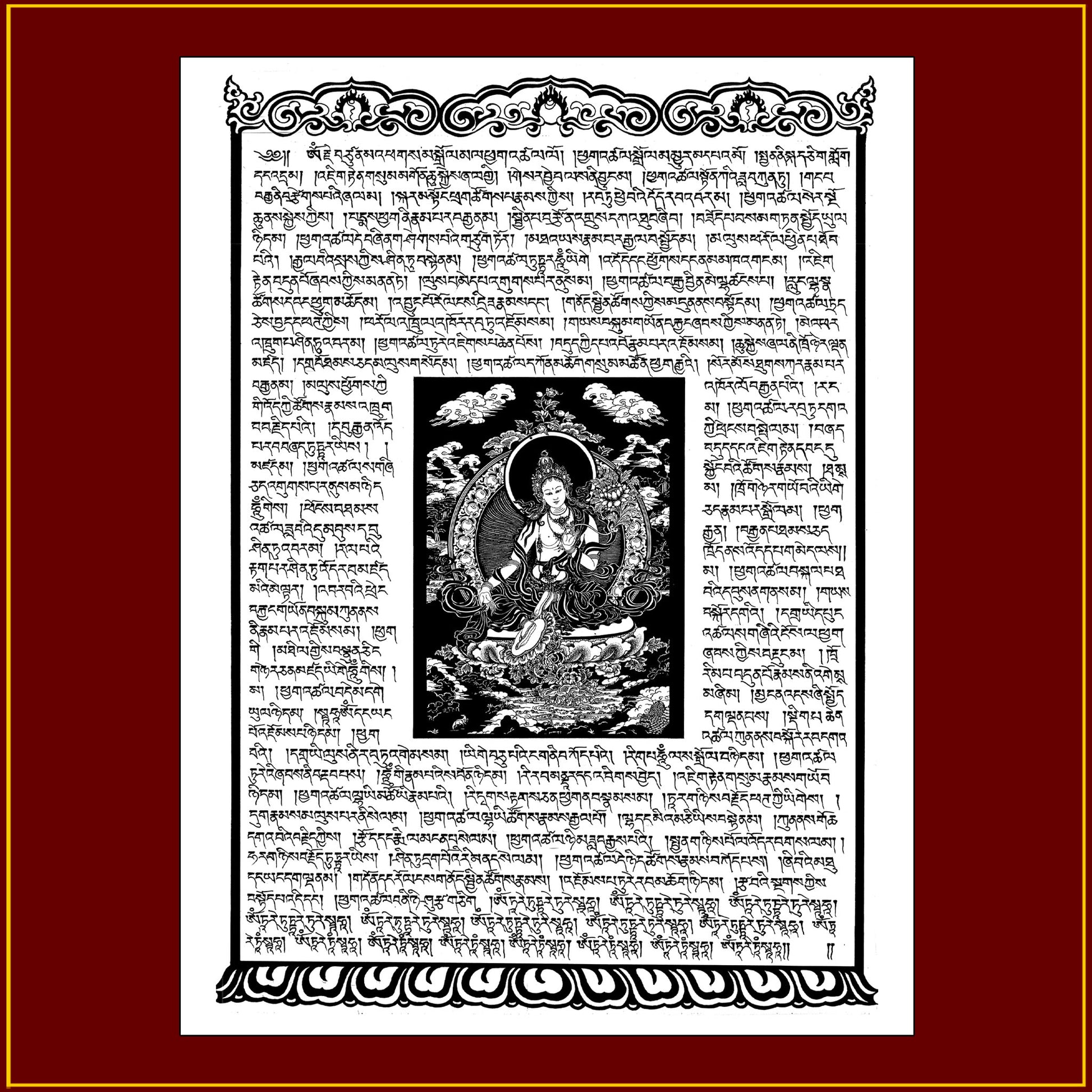 At one time Avalokiteshvara, the Bodhisattva of compassion, emptied all of the hell realms. But as he looked again the hell realms were immediately refilled. As he shed tears for these beings one tear transformed into the saviouress Green Tara who manifested her twenty other forms. The Tibetan script on this traditional flag praises Tara in all her manifestations. The verses conclude with her root mantra "OM TARE TU TARE TURE SOHA," the magical syllables that evoke the goddess.