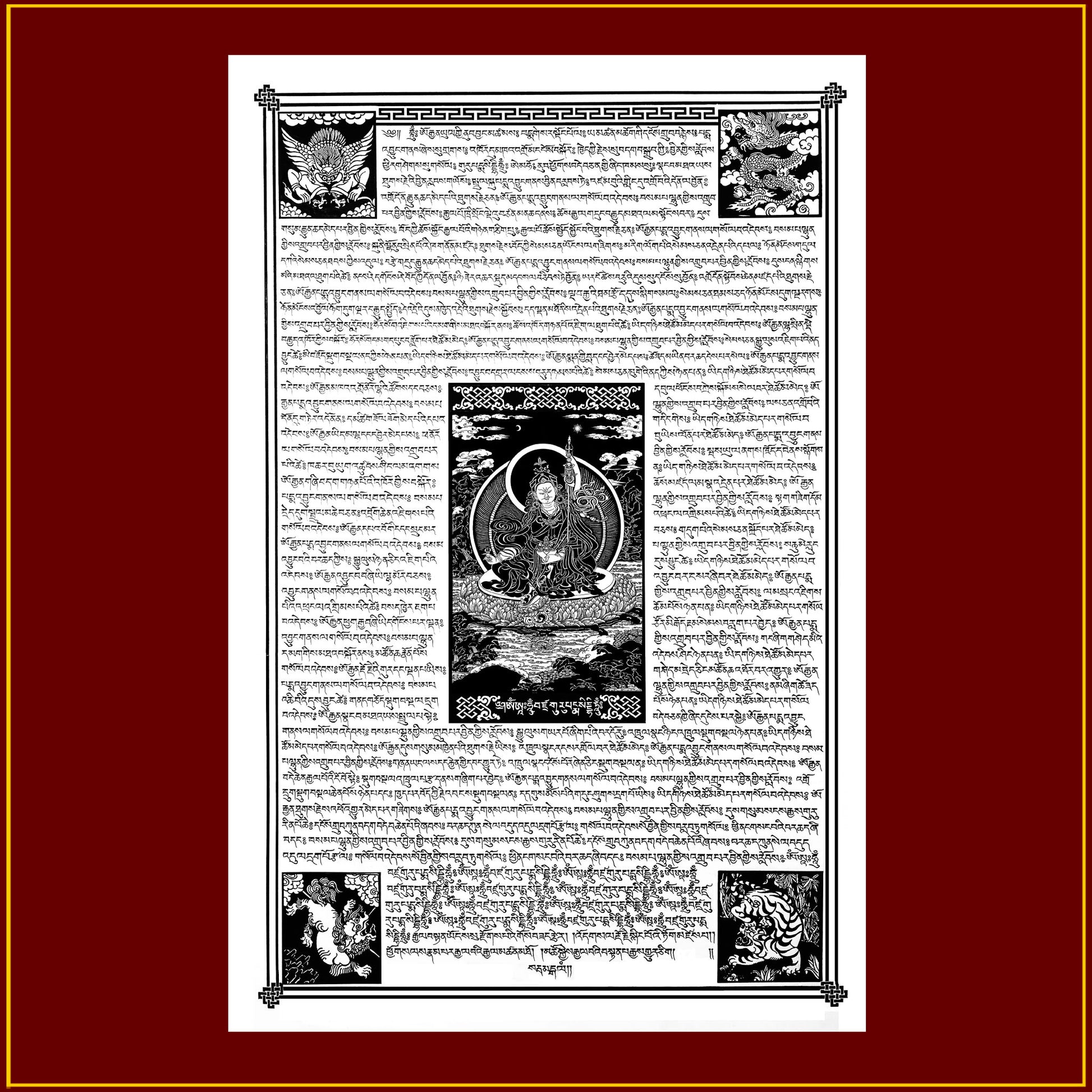 The text on this traditional Tibetan prayer flag is called "The Quick Wish Fulfilling Prayer of Padmasambhava." In the center of the flag the precious Guru, Padmasambhava, is depicted above his mantra "OM AH HUM VAJRA GURU PADMA SIDDHI HUNG." At the corners of the flag are the "Four Dignities" - Garuda, Dragon, Snow Lion, and Snow Tiger.