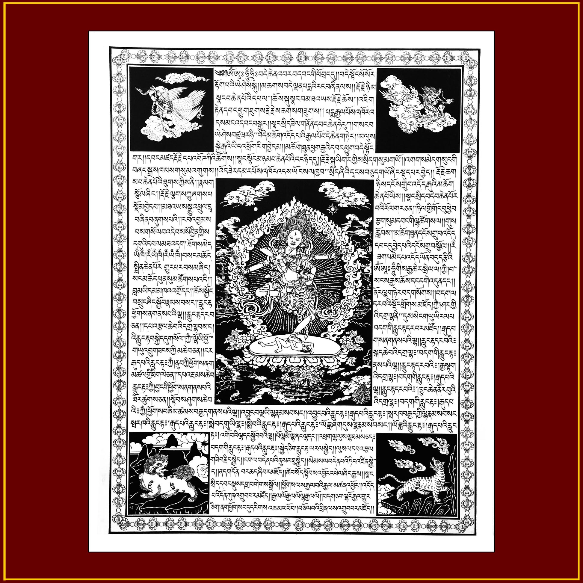 This traditional prayer flag is used for increasing one's power and control over the phenomenal world through the the power of Kurukulle, the wrathful standing red Tara. Her 4 arms hold a hook, a lasso, a bow and arrow (all made of flowers) with which she subdues all obstacles. She treads on a figure representing duality and egotism. In the corners of the flag are animals symbolizing the powers of the four directions. The text has a prayer to Kurukulle and slokas for the 4 Dignities. The purpose of this flag is to suppress negative energy and enemies, to overcome obstacles and to increase health, wealth, and longevity.