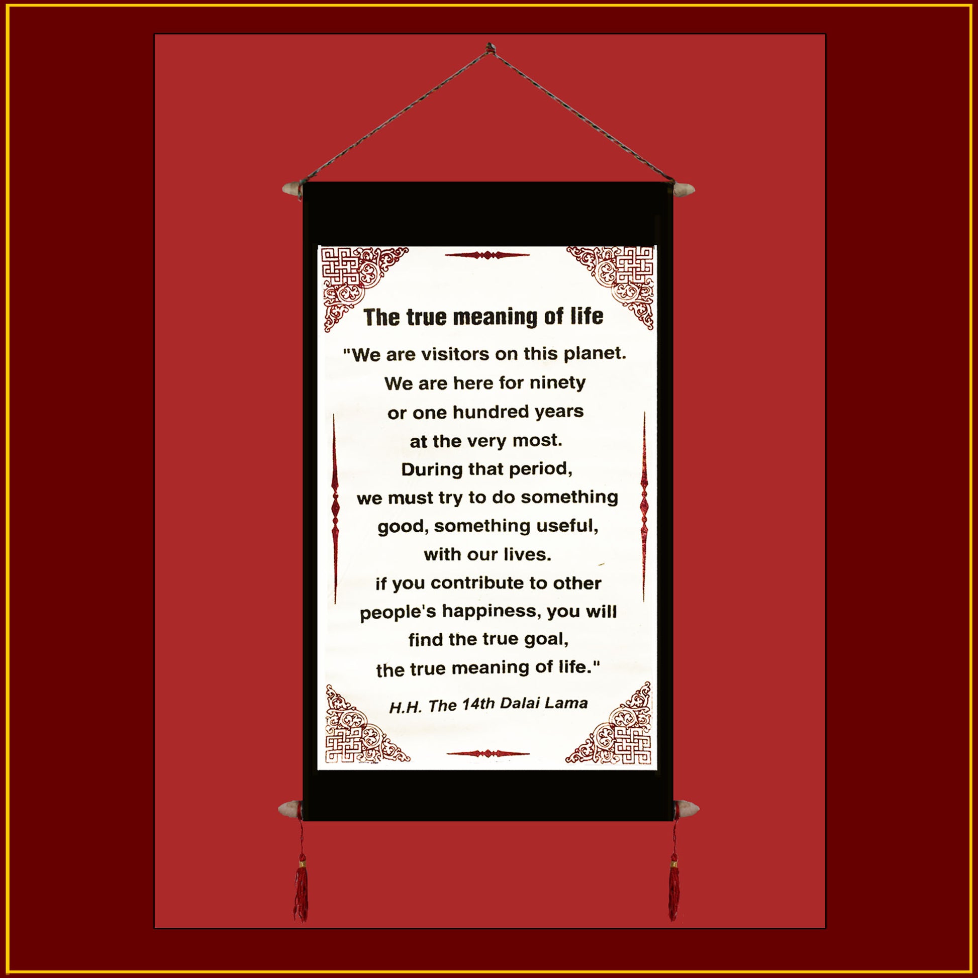 This 9"x 16" cloth scroll has a short teaching called "The True Meaning of Life," by H.H. the14th Dalai Lama: