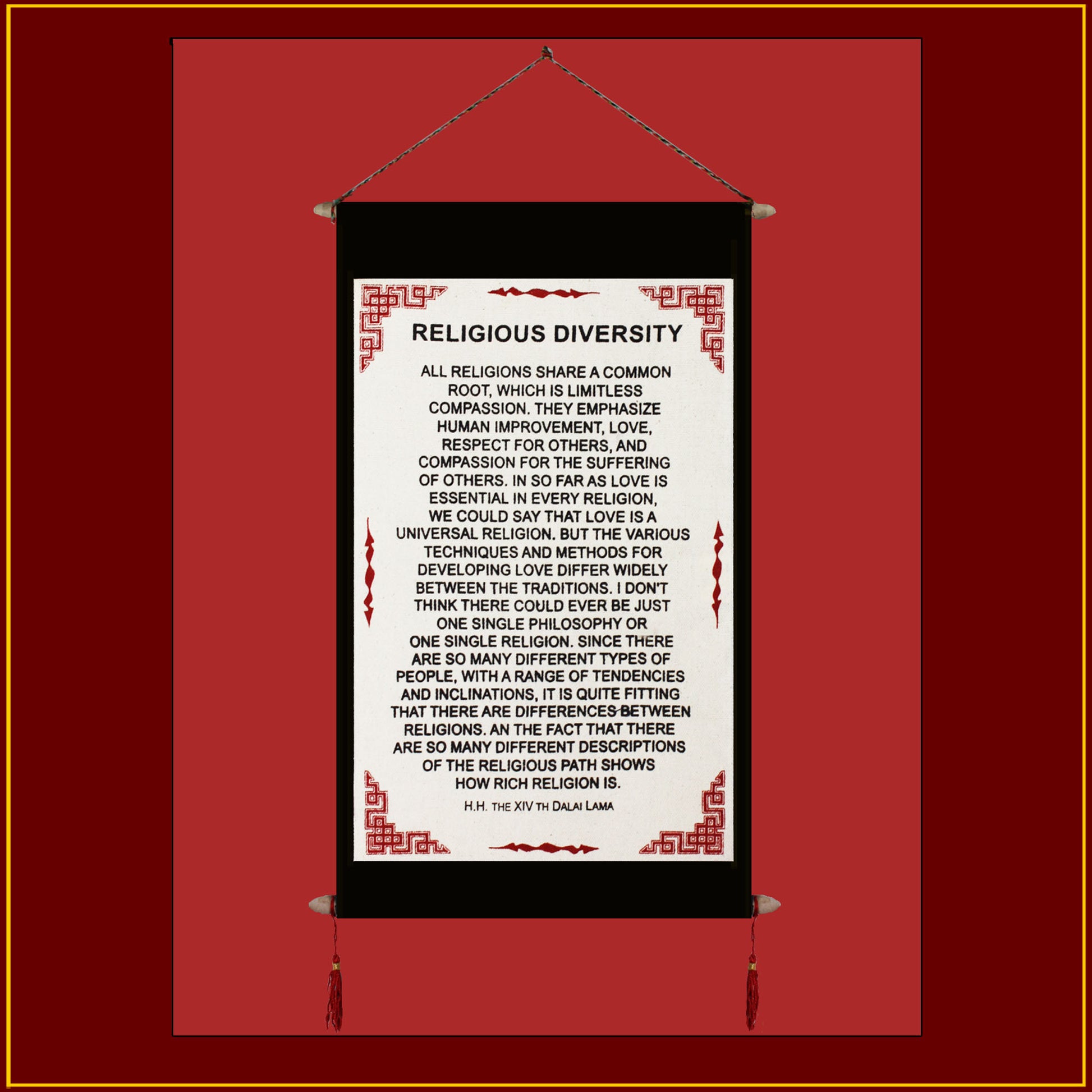 This 9"x 16" cloth scroll has a short teaching on love being common to all religions by H.H. the14th Dalai Lama: