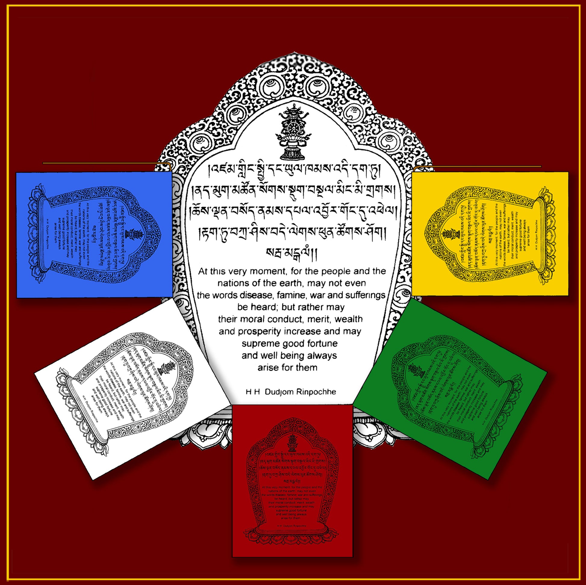 "At this very moment for the people and the nations of the earth may not even the words - disease, famine, war and suffering be heard; but rather may their moral conduct, merit, wealth and prosperity increase and may supreme good fortune and well being always arise for them." This beautiful prayer, written by HH Dudjom Rinpoche, is shown in Tibetan and in English on this flag dedicated to world peace. Each flag is 8"x 10" They come in sets of 5, 10 and 25 sewn on ropes (approximately 3.5ft, 7ft, and 17ft long respectively). The edges have a matching thread hem-stitch
